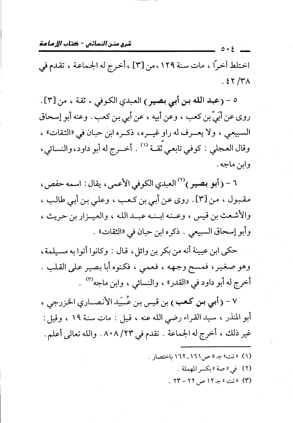 5 - (عبد الله بن أبي بصير) العمدي الكوفي، ثقة، من [3]. روى عن أبَيّ بن كعب، وعن أبيه، عن أبي بن كعب. وعنه أبو إسحاق السبيعي، ولا يعرف له راوٍ غيره، ذكره ابن حبان في "الثقات"، وقال العجلي: كوفي تابعي ثقة (¬1). أخرج له أبو داود، والنسائي، وابن ماجه.
