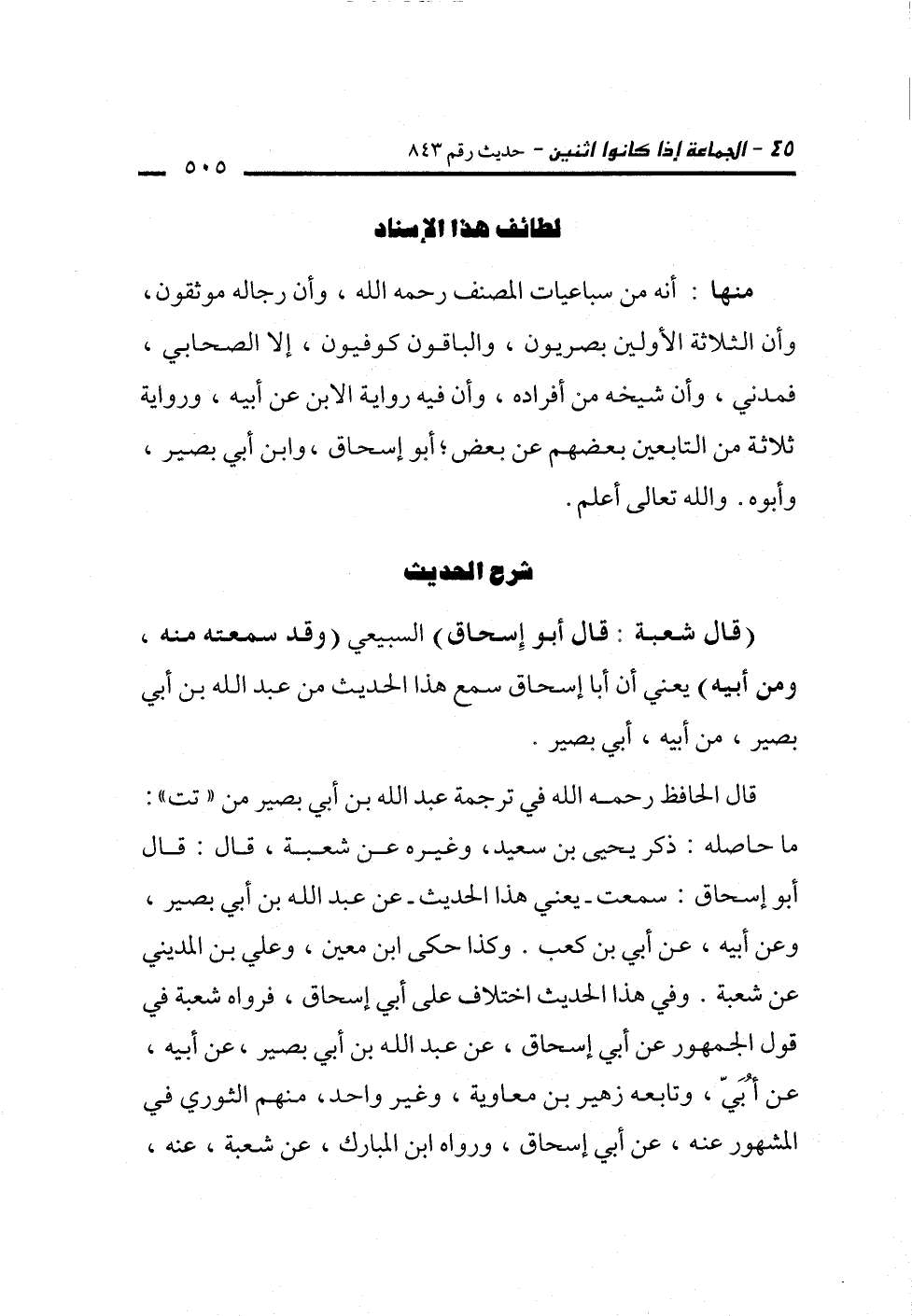 قال الحافظ رحمه الله في ترجمة عبد الله بن أبي بصير من "تت": ما حاصله: ذكر يحيى بن سعيد، وغيره عن شعبة، قال: قال أبو إسحاق. سمعت -يعني هذا الحديث- عن عبد الله بن أبي بصير، وعن أبيه، عن أبي بن كعب. وكذا حكى ابن معين، وعلي بن المديني عن شعبة. وفي هذا الحديث اختلاف على أبي إسحاق، فرواه شعبة في قول الجمهور عن أبي إسحاق، عن عبد الله بن أبي بصير، عن أبيه، عن أُبَيّ، وتابعه زهير بن معاوية، وغير واحد، منهم الثوري في المشهور عنه، عن أبي إسحاق، ورواه ابن المبارك، عن شعبة، عنه،