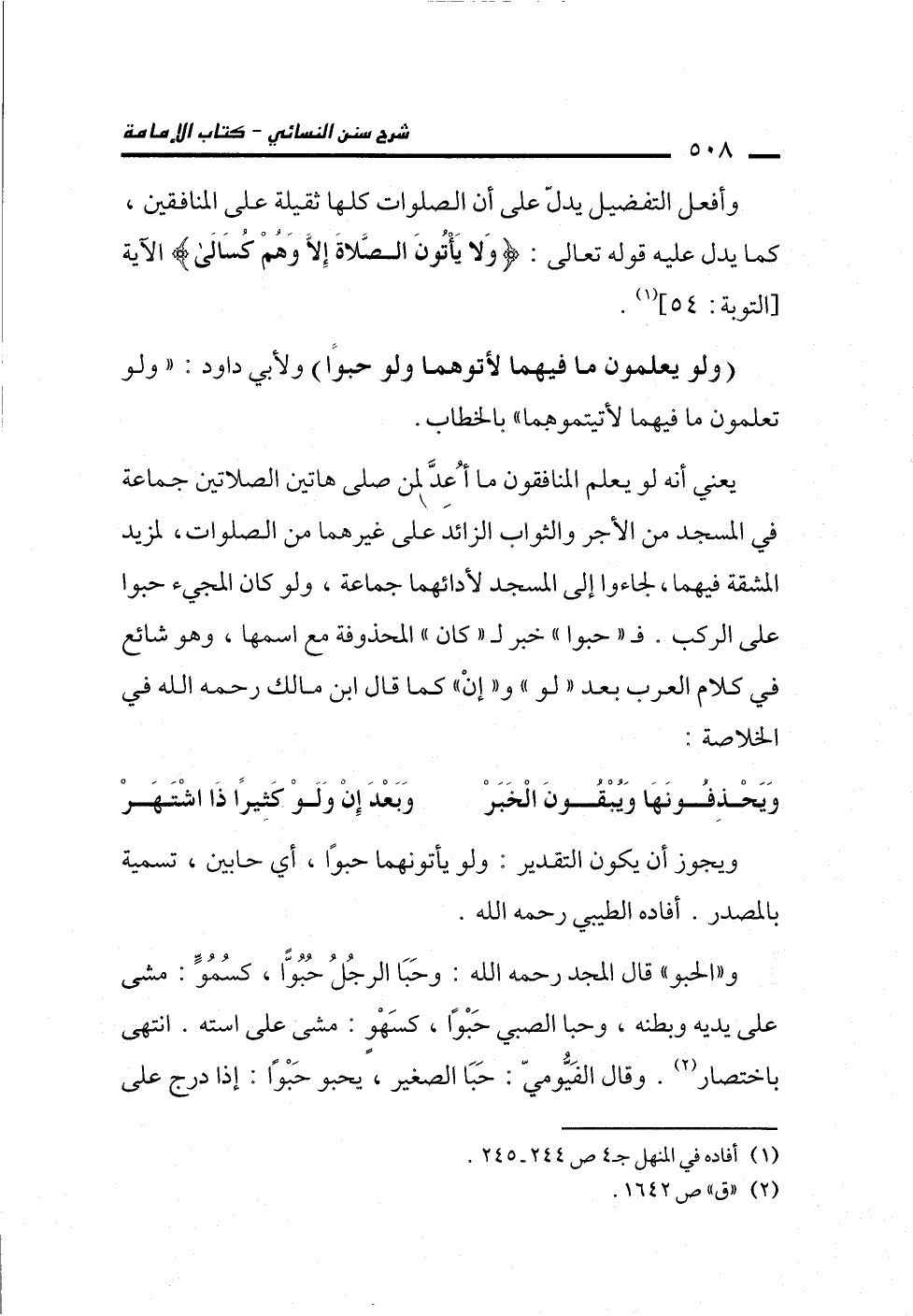 يعني أنه لو يعلم المنافقون ما أُعِدَّ لمن صلى هاتين الصلاتين جماعة في المسجد من الأجر والثواب الزائد على غيرهما من الصلوات، لمزيد المشقة فيهما، لجاءوا إلى المسجد لأدائهما جماعة، ولو كان المجيء حبوا على الركب. فـ"حبوا" خبر لـ" كان" المحذوفة مع اسمها، وهو شائع في كلام العرب بعد "لو" و"إنْ" كما قال ابن مالك رحمه الله في الخلاصة: