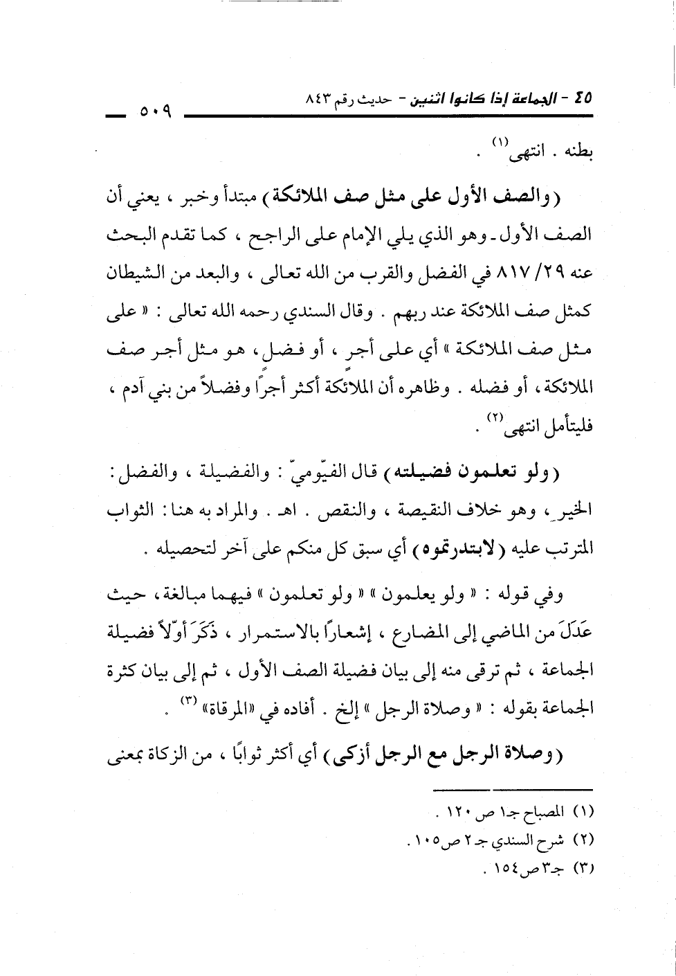 (والصف الأول على مثل صف الملائكة) مبتدأ وخبر، يعني أن الصف الأول -وهو الذي يلي الإِمام على الراجح، كما تقدم البحث عنه 29/ 817 في الفضل والقرب من الله تعالى، والبعد من الشيطان كمثل صف الملائكة عند ربهم. وقال السندي رحمه الله تعالى: "على مثل صف الملائكة" أي على أجر، أو فضلٍ، هو مثل أجر صف الملائكة، أو فضله. وظاهره أن الملائكة أكثر أجرًا وفضلاً من بني آدم، فليتأمل انتهى (¬2).