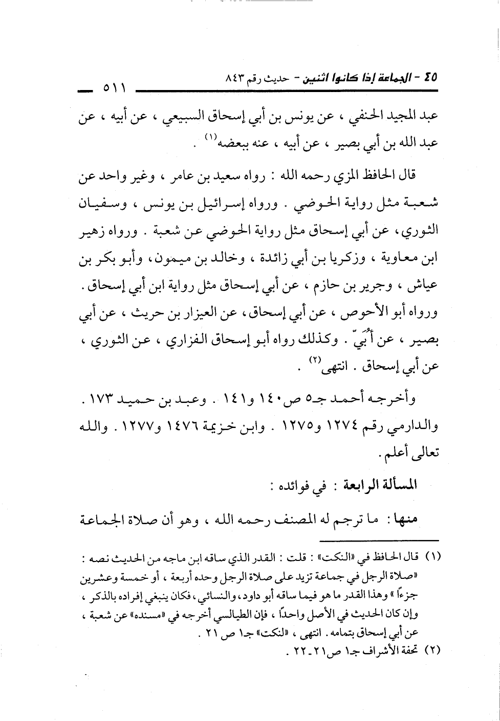 (¬1) قال الحافظ في "النكت": قلت: القدر الذي ساقه ابن ماجه من الحديث نصه: "صلاة الرجل في جماعة تزيد على صلاة الرجل وحده أربعة، أو خمسة وعشرين جزءاً" وهذا القدر ما هو فيما ساقه أبو داود، والنسائي، فكان ينبغي إفراده بالذكر، وإن كان الحديث في الأصل واحدًا، فإن الطيالسي أخرجه في "مسنده" عن شعبة، عن أبي إسحاق بتمامه. انتهى، "النكت" جـ 1 ص 21.