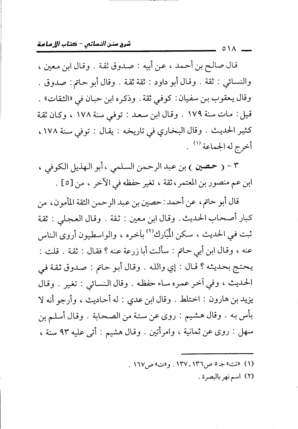 قال أبو حاتم، عن أحمد: حصين بن عبد الرحمن الثقة المأمون، من كبار أصحاب الحديث. وقال ابن معين: ثقة وقال العجلي: ثقة ثبت في الحديث، سكن المُبَارك (¬2) بآخره، والواسطيون أروى الناس عنه، وقال ابن أبي حاتم: سألت أبا زرعة عنه؟ فقال: ثقة. قلت: يحتح بحديثه؟ قال: إي والله. وقال أبو حاتم. صدوق ثقة في الحديث، وهي آخر عمره ساء حفظه. وقال النسائي. تغير. وقال يزيد بن هارون: اختلط. وقال ابن عدي: له أحاديث، وأرجو أنه لا بأس به. وقال هشيم: روى عن ستة عن الصحابة. وقال أسلم بن سهل: روى عن ثمانية، وامرأتين. وقال هشيم: أتى عليه 93 سنة،