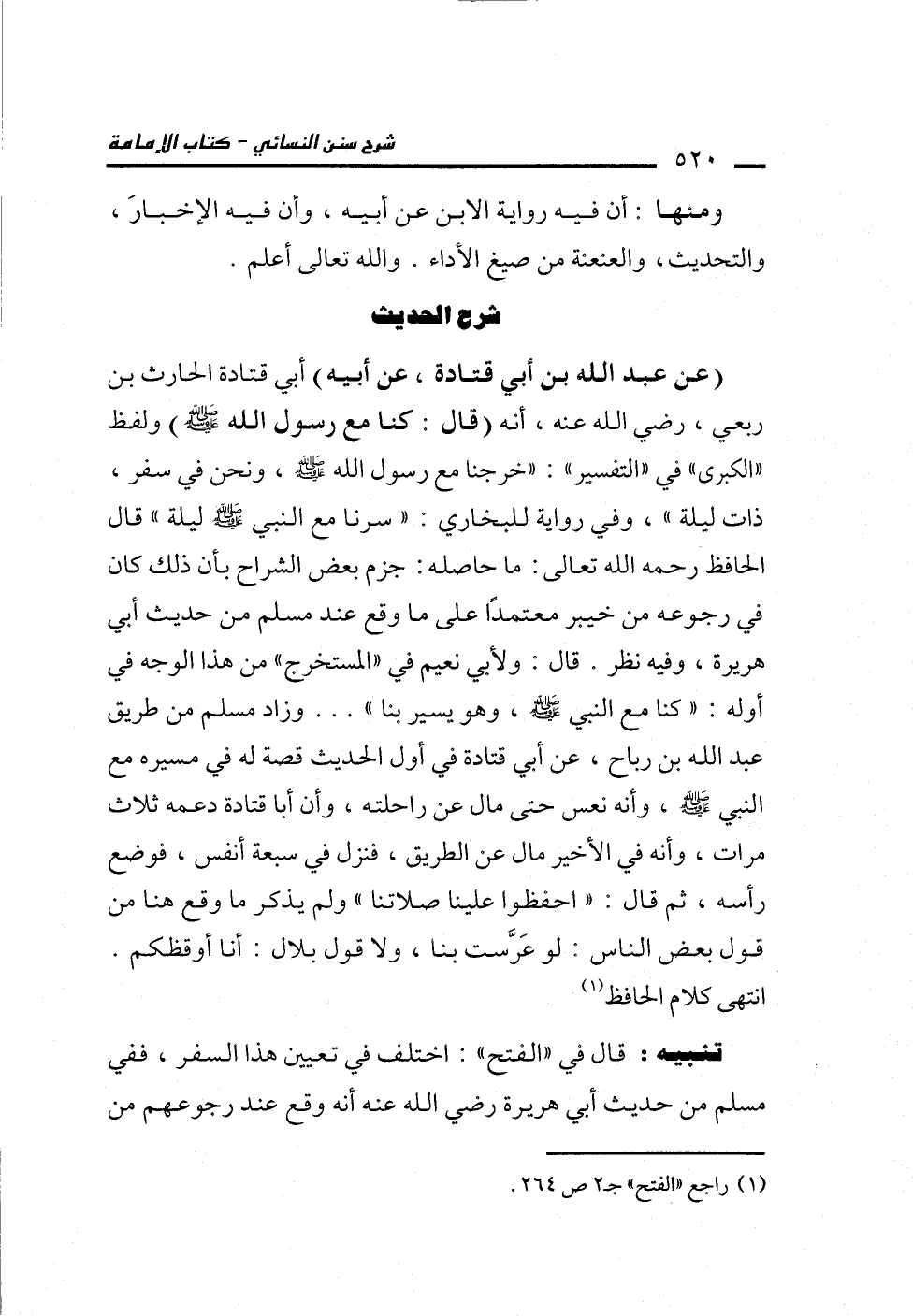 (عن عبد الله بن أبي قتادة، عن أبيه) أبي قتادة الحارث بن ربعي، رضي الله عنه، أنه (قال: كنا مع رسول الله -صلى الله عليه وسلم-) ولفظ "الكبرى" في "التفسير": "خرجنا مع رسول الله -صلى الله عليه وسلم-، ونحن في سفر، ذات ليلة"، وفي رواية للبخاري: "سرنا مع النبي -صلى الله عليه وسلم- ليلة" قال الحافظ رحمه الله تعالى: ما حاصله: جزم بعض الشراح بأن ذلك كان في رجوعه من خيبر معتمدًا على ما وقع عند مسلم من حديث أبي هريرة، وفيه نظر. قال: ولأبي نعيم في "المستخرج" من هذا الوجه في أوله:" كنا مع النبي -صلى الله عليه وسلم-، وهو يسير بنا" ... وزاد مسلم من طريق عبد الله بن رباح، عن أبي قتادة في أول الحديث قصة له فى مسيره مع النبي -صلى الله عليه وسلم-، وأنه نعس حتى مال عن راحلته، وأن أبا قتادة دعمه ثلاث مرات، وأنه في الأخير مال عن الطريق، فنزل في سبعة أنفس، فوضع رأسه، ثم قال: "احفظوا علينا صلاتنا" ولم يذكر ما وقع هنا من قول بعض الناس: لو عَرَّست بنا ولا قول بلال: أنا أوقظكم. انتهى كلام الحافظ (¬1)