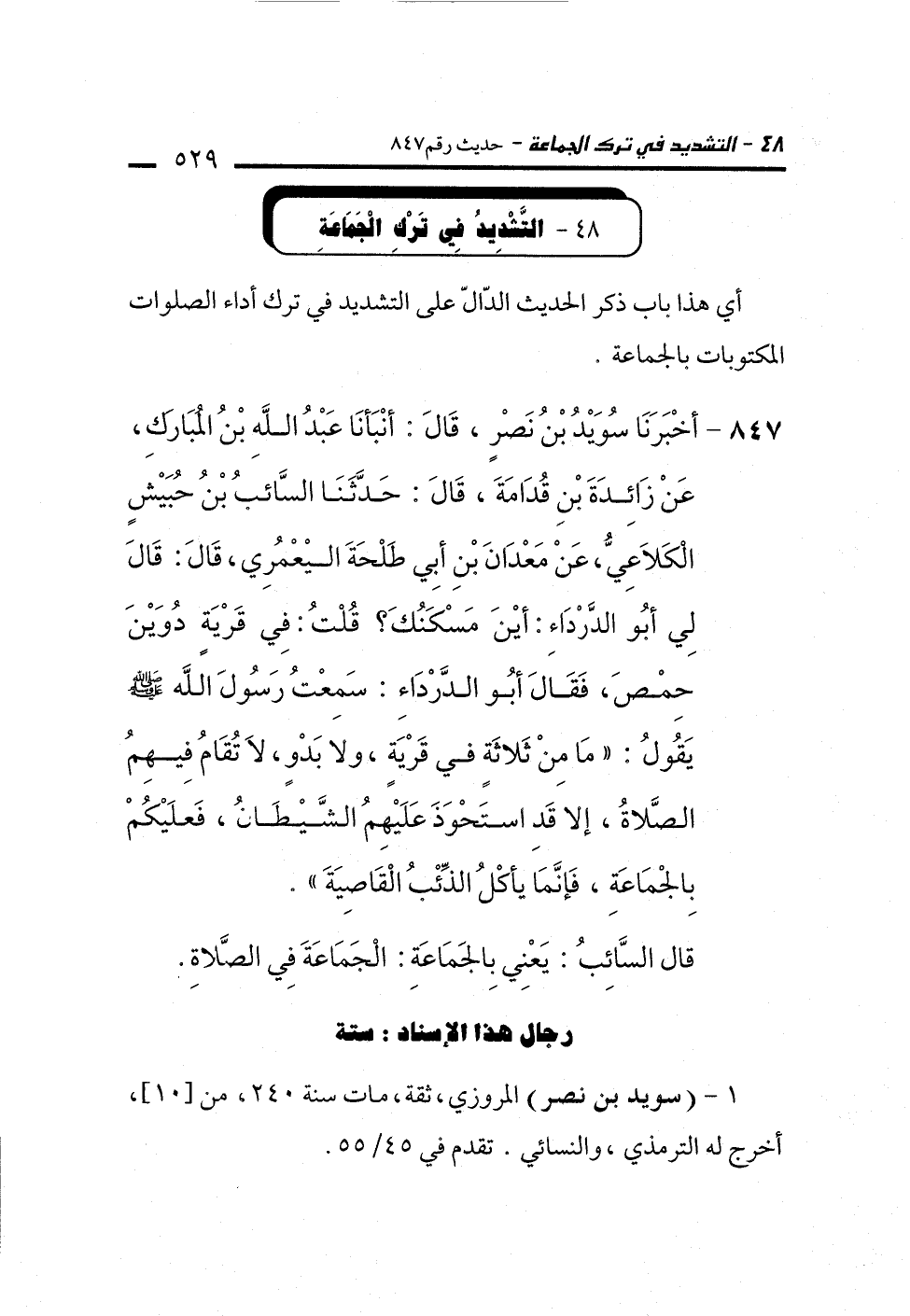 847 - أَخْبَرَنَا سُوَيْدُ بْنُ نَصْرٍ، قَالَ: أَنْبَأَنَا عَبْدُ اللَّهِ بْنُ الْمُبَارَكِ، عَنْ زَائِدَةَ بْنِ قُدَامَةَ، قَالَ: حَدَّثَنَا السَّائِبُ بْنُ حُبَيْشٍ الْكَلاَعِيُّ، عَنْ مَعْدَانَ بْنِ أَبِي طَلْحَةَ الْيَعْمَرِيِّ، قَالَ: قَالَ لِي أَبُو الدَّرْدَاءِ: أَيْنَ مَسْكَنُكَ؟ قُلْتُ: فِي قَرْيَةٍ دُوَيْنَ حِمْصَ، فَقَالَ أَبُو الدَّرْدَاءِ: سَمِعْتُ رَسُولَ اللَّهِ -صلى الله عليه وسلم- يَقُولُ: "مَا مِنْ ثَلاَثَةٍ فِي قَرْيَةٍ، وَلاَ بَدْوٍ، لاَ تُقَامُ فِيهِمُ الصَّلاَةُ، إِلاَّ قَدِ اسْتَحْوَذَ عَلَيْهِمُ الشَّيْطَانُ، فَعَلَيْكُمْ بِالْجَمَاعَةِ، فَإِنَّمَا يَأْكُلُ الذِّئْبُ الْقَاصِيَةَ".