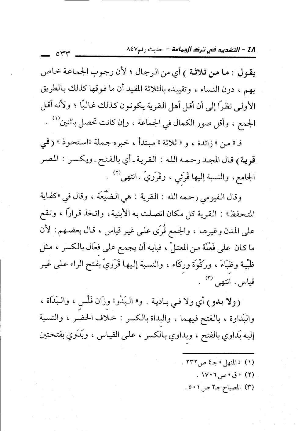 يقول: ما من ثلاثة) أي من الرجال؛ لأن وجوب الجماعة خاص بهم، دون النساء، وتقييده بالثلاثة المفيد أن ما فوقها كذلك بالطريق الأولى نظرًا إلى أن أقل أهل القرية يكونون كذلك غالبًا؛ ولأنه أقل الجمع، وأقل صور الكمال في الجماعة، وإن كانت تحصل باثنين (¬1).
