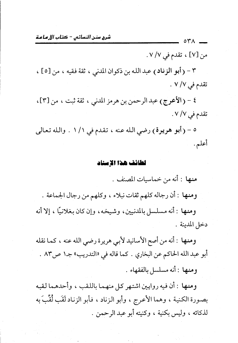 ومنها: أن فيه روايين اشتهر كل منهما باللقب، وأحدهما لقبه بصورة الكنية، وهما الأعرج، وأبو الزناد، فأبو الزناد لَقَب لُقِّبَ به لذكائه، وليس بكنية، وكنيته أبو عبد الرحمن.