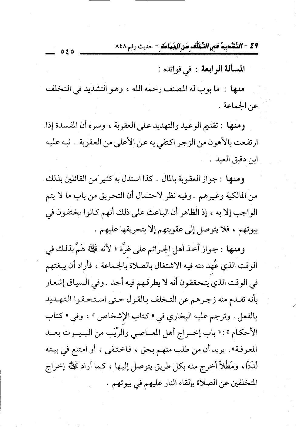 ومنها: جواز العقوبة بالمال. كذا استدل به كثير من القائلين بذلك من المالكية وغيرهم. وفيه نظر لاحتمال أن التحريق من باب ما لا يتم الواجب إلا به، إذ الظاهر أن الباعث على ذلك أنهم كانوا يختفون في بيوتهم، فلا يتوصل إلى عقوبتهم إلا بتحريقها عليهم.