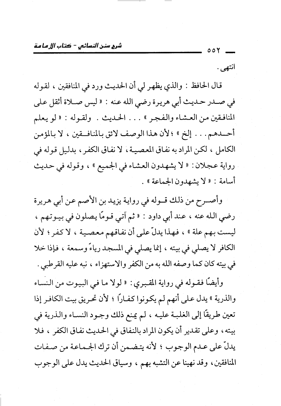 وأيضًا فقوله في رواية المقبري: "لولا ما في البيوت من النساء والذرية" يدل على أنهم لم يكونوا كفارًا؛ لأن تحريق بيت الكافر إذا تعين طريقًا إلى الغلبة عليه، لم يمنع ذلك وجود النساء والذرية في بيته، وعلى تقدير أن يكون المراد بالنفاق في الحديث نفاق الكفر، فلا يدلّ على عدم الوجوب؛ لأنه يتضمن أن ترك الجماعة من صفات المنافقين، وقد نهينا عن التشبه بهم، وسياق الحديث يدل على الوجوب