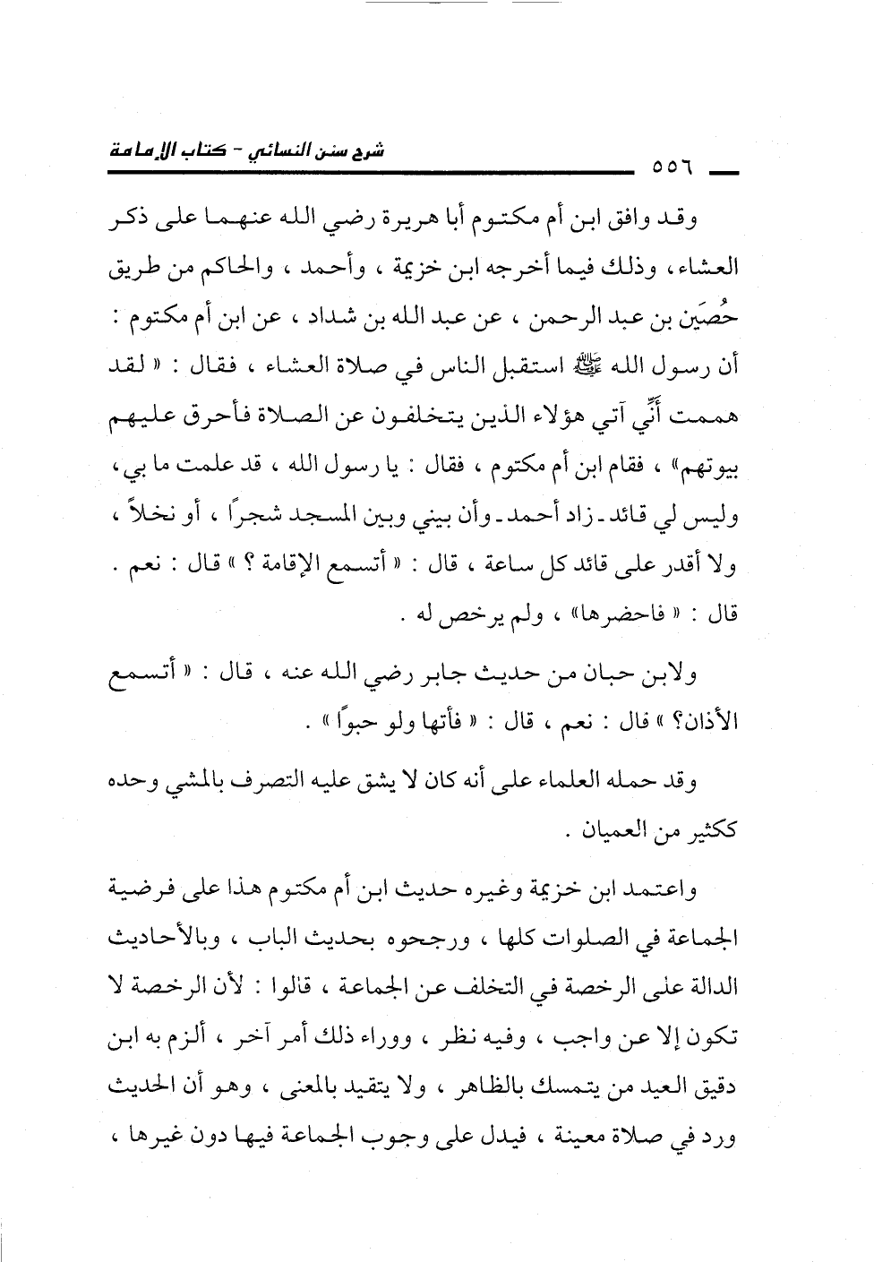 واعتمد ابن خزيمة وغيره حديث ابن أم مكتوم هذا على فرضية الجماعة في الصلوات كلها، ورجحوه بحديث الباب، وبالأحاديث الدالة على الرخصة في التخلف عن الجماعة، قالوا: لأن الرخصة لا تكون إلا عن واجب، وفيه نظر، ووراء ذلك أمر آخر، ألزم به ابن دقيق العيد من يتمسك بالظاهر، ولا يتقيد بالمعنى، وهو أن الحديث ورد في صلاة معينة، فيدل على وجوب الجماعة فيها دون غيرها،