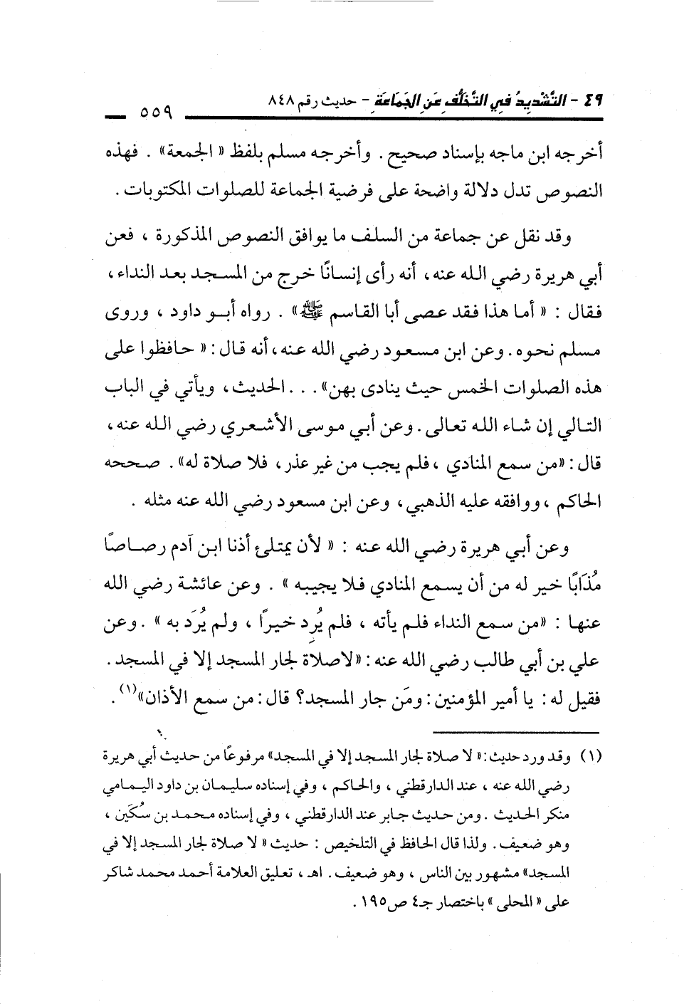 (¬1) وقد ورد حديث: "لا صلاة لجار المسجد إلا في المسجد" مرفوعًا من حديث أبي هريرة رضي الله عنه، عند الدارقطني، والحاكم، وفي إسناده سليمان بن داود اليمامي منكر الحديث. ومن حديث جابر عند الدارقطني، وفي إسناده محمد بن سُكَين، وهو ضعيف. ولذا قال الحافظ في التلخيص: حديث "لا صلاة لجار المسجد إلا في المسجد" مشهور بين الناس، وهو ضعيف. اهـ، تعليق العلامة أحمد محمد شاكر على "المحلى" باختصار جـ 4 ص 195.