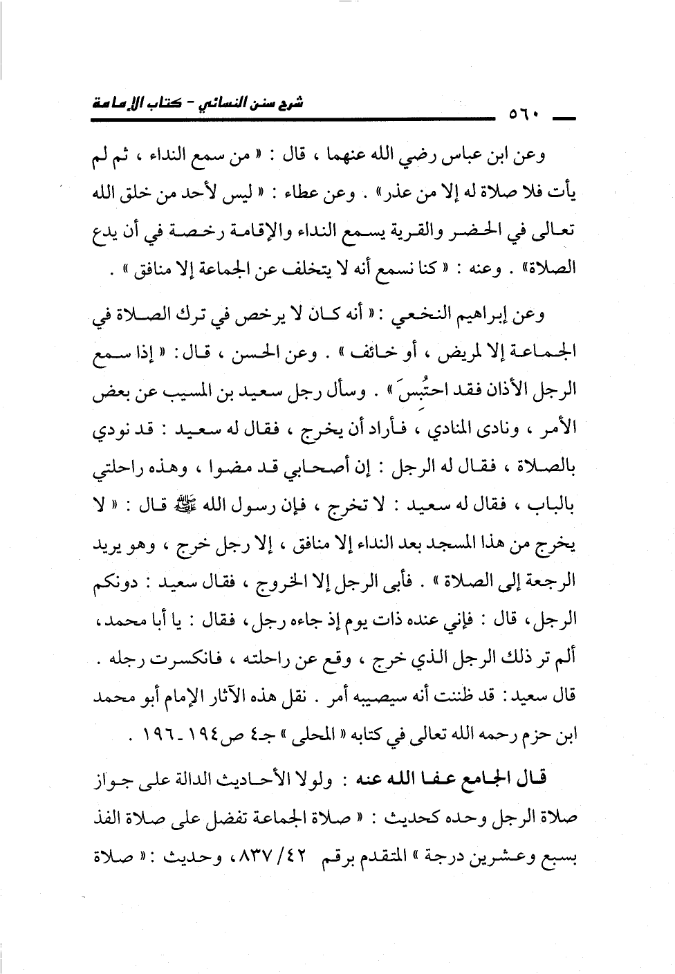 وعن إبراهيم النخعي: " أنه كان لا يرخص في ترك الصلاة في الجماعة إلا لمريض، أو خائف". وعن الحسن، قال: "إذا سمع الرجل الأذان فقد احتُبسَ". وسأل رجل سعيد بن المسيب عن بعض الأمر، ونادى المنادي، فأراد أن يخرج، فقال له سعيد: قد نودي بالصلاة، فقال له الرجل: إن أصحابي قد مضوا، وهذه راحلتي بالباب، فقال له سعيد: لا تخرج، فإن رسول الله -صلى الله عليه وسلم- قال: "لا يخرج من هذا المسجد بعد النداء إلا منافق، إلا رجل خرج، وهو يريد الرجعة إلى الصلاة". فأبى الرجل إلا الخروج، فقال سعيد: دونكم الرجل، قال: فإني عنده ذات يوم إذ جاءه رجل، فقال: يا أبا محمد، ألم تر ذلك الرجل الذي خرج، وقع عن راحلته، فانكسرت رجله. قال سعيد: قد ظننت أنه سيصيبه أمر. نقل هذه الآثار الإِمام أبو محمد ابن حزم رحمه الله تعالى في كتابه "المحلى" جـ 4 ص 194 - 196.