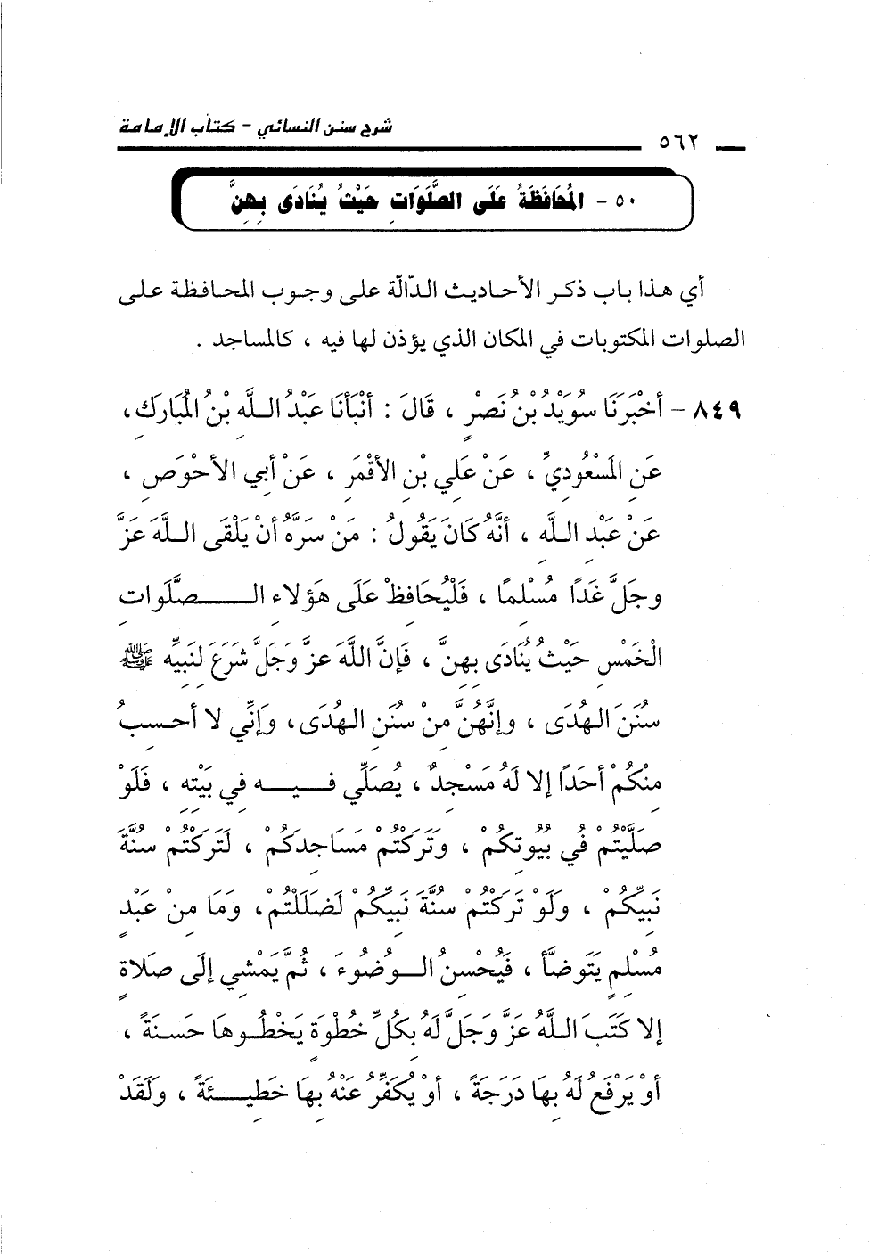 849 - أَخْبَرَنَا سُوَيْدُ بْنُ نَصْرٍ، قَالَ: أَنْبَأَنَا عَبْدُ اللَّهِ بْنُ الْمُبَارَكِ، عَنِ الْمَسْعُودِيِّ، عَنْ عَلِيِّ بْنِ الأَقْمَرِ، عَنْ أَبِي الأَحْوَصِ، عَنْ عَبْدِ اللَّهِ، أَنَّهُ كَانَ يَقُولُ: مَنْ سَرَّهُ أَنْ يَلْقَى اللَّهَ عَزَّ وَجَلَّ غَدًا مُسْلِمًا، فَلْيُحَافِظْ عَلَى هَؤُلاَءِ الصَّلَوَاتِ الْخَمْسِ حَيْثُ يُنَادَي بِهِنَّ، فَإِنَّ اللَّهَ عَزَّ وَجَلَّ شَرَعَ لِنَبِيِّهِ -صلى الله عليه وسلم- سُنَنَ الْهُدَى، وَإِنَّهُنَّ مِنْ سُنَنِ الْهُدَى، وَإِنِّي لاَ أَحْسَبُ مِنْكُمْ أَحَدًا إِلاَّ لَهُ مَسْجِدٌ، يُصَلِّي فِيهِ فِي بَيْتِهِ، فَلَوْ صَلَّيْتُمْ فِي بُيُوتِكُمْ، وَتَرَكْتُمْ مَسَاجِدَكُمْ، لَتَرَكْتُمْ سُنَّةَ نَبِيِّكُمْ، وَلَوْ تَرَكْتُمْ سُنَّةَ نَبِيِّكُمْ لَضَلَلْتُمْ، وَمَا مِنْ عَبْدٍ مُسْلِمٍ يَتَوَضَّأُ، فَيُحْسِنُ الْوُضُوءَ، ثُمَّ يَمْشِى إِلَى صَلاَةٍ إِلاَّ كَتَبَ اللَّهُ عَزَّ وَجَلَّ لَهُ بِكُلِّ خُطْوَةٍ يَخْطُوهَا حَسَنَةً، أَوْ يَرْفَعُ لَهُ بِهَا دَرَجَةً، أَوْ يُكَفِّرُ عَنْهُ بِهَا خَطِيئَةً، وَلَقَدْ