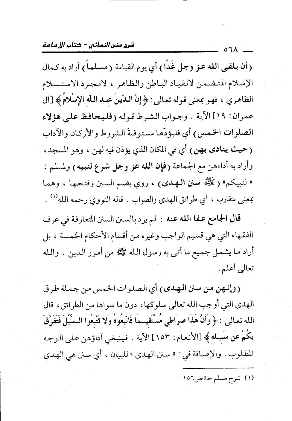 (أن يلقى الله عز وجل غَدًا) أي يوم القيامة (مسلماً) أراد به كمال الإِسلام المتضمن لانقياد الباطن والظاهر، لا مجرد الاستسلام الظاهري، فهو بمعنى قوله تعالى: {إِنَّ الدِّينَ عِنْدَ اللَّهِ الْإِسْلَامُ} [آل عمران: 19]، الآية. وجواب الشرط قوله (فليحافظ على هؤلاء الصلوات الخمس) أي فليؤدّها مستوفيةَ الشروط والأركان والآداب (حيث ينادى بهن) أي في المكان الذي يؤذن فيه لهن، وهو المسجد، وأراد به أداءهن مع الجماعة (فإِن الله عَزَّ وَجَلَّ شرع لنبيه) ولمسلم: "لنبيكم" (-صلى الله عليه وسلم- سنن الهدى)، روي بضم السين وفتحها، وهما بمعنى متقارب، أي طرائق الهدى والصواب. قاله النووي رحمه الله (¬1).