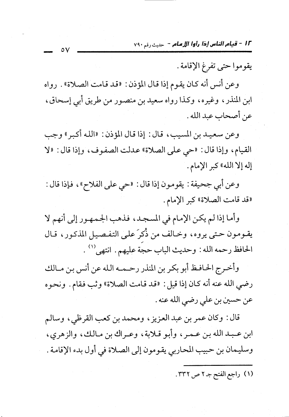 قال: وكان عمر بن عبد العزيز، ومحمد بن كعب القرظي، وسالم ابن عبد الله بن عمر، وأبو قلابة، وعراك بن مالك، والزهري، وسليمان بن حبيب المحاربي يقومون إلى الصلاة في أول بدء الإقامة.