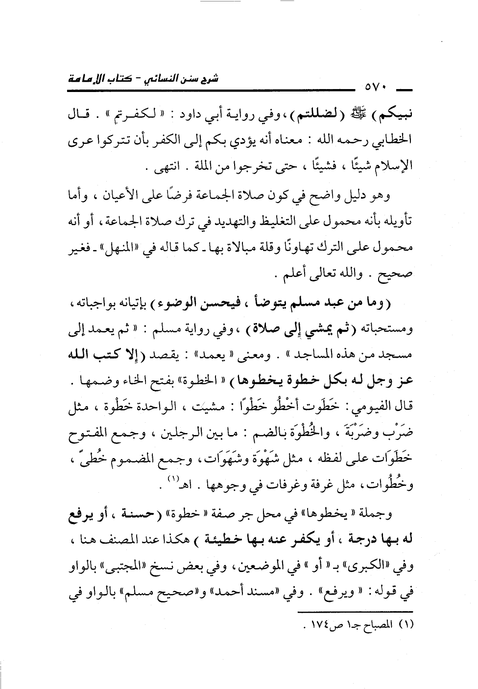 (وما من عبد مسلم يتوضأ، فيحسن الوضوء) بإتيانه بواجباته، ومستحباته (ثم يمشي إِلى صلاة)، وهي رواية مسلم: "ثم يعمد إلى مسجد من هذه المساجد". ومعنى "يعمد": يقصد (إِلا كتب الله عَزَّ وَجَلَّ له بكل خطوة يخطوها) "الخطوة" بفتح الخاء وضمها. قال الفيومي: خطَوت أخْطُو خطْوًا: مشيت، الواحدة خَطْوة، مثل ضَرْب وضَرْبَةَ، والخُطْوَة بالضم: ما بين الرجلين، وجمع المفتوح خَطَوَات على لفظه، مثل شَهْوَة وشَهَوَات، وجمع المضموم خُطىً، وخُطُوات، مثل غرفة وغرفات في وجوهها. اهـ (¬1).