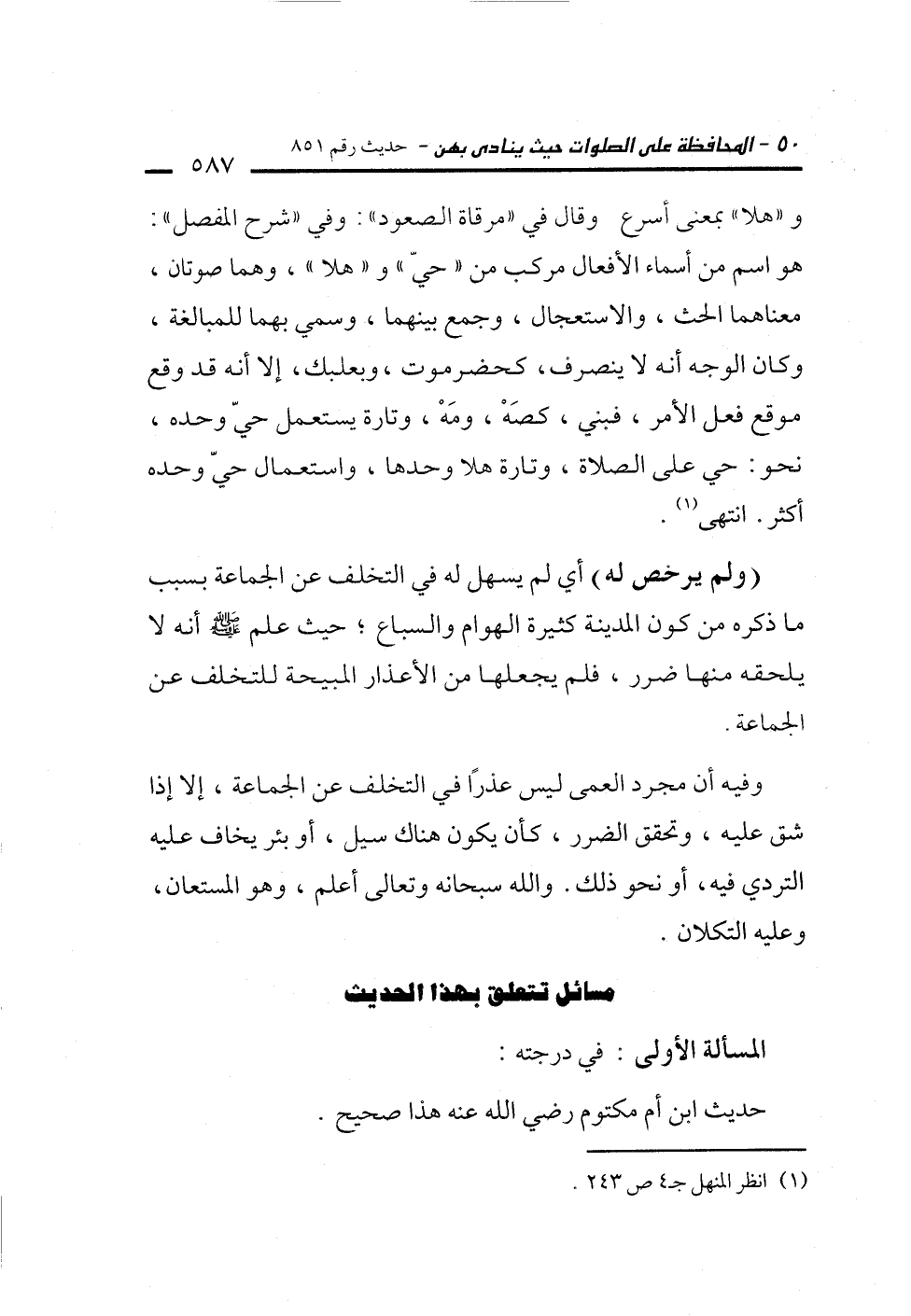 وفيه أن مجرد العمى ليس عذرًا في التخلف عن الجماعة، إلا إذا شق عليه، وتحقق الضرر، كأن يكون هناك سيل، أو بئر يخاف عليه التردي فيه، أو نحو ذلك. والله سبحانه وتعالى أعلم، وهو المستعان، وعليه التكلان.
