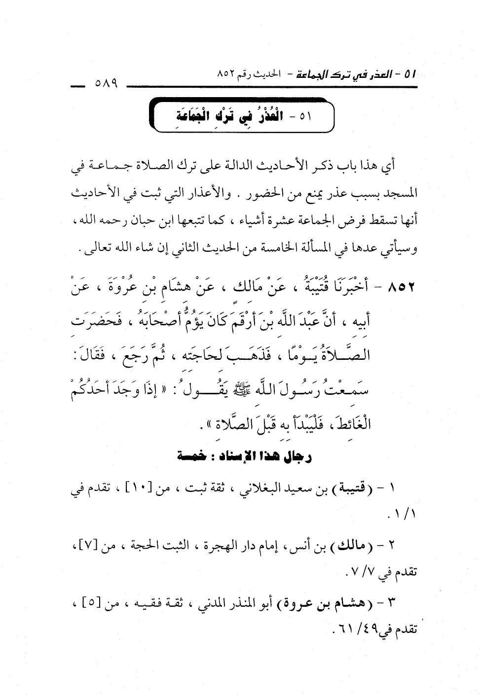 852 - أَخْبَرَنَا قُتَيْبَةُ، عَنْ مَالِكٍ، عَنْ هِشَامِ بْنِ عُرْوَةَ، عَنْ أَبِيهِ، أَنَّ عَبْدَ اللَّهِ بْنَ أَرْقَمَ كَانَ يَؤُمُّ أَصْحَابَهُ، فَحَضَرَتِ الصَّلاَةُ يَوْمًا، فَذَهَبَ لِحَاجَتِهِ، ثُمَّ رَجَعَ، فَقَالَ: سَمِعْتُ رَسُولَ اللَّهِ -صلى الله عليه وسلم- يَقُولُ: "إِذَا وَجَدَ أَحَدُكُمُ الْغَائِطَ، فَلْيَبْدَأْ بِهِ قَبْلَ الصَّلاَةِ".