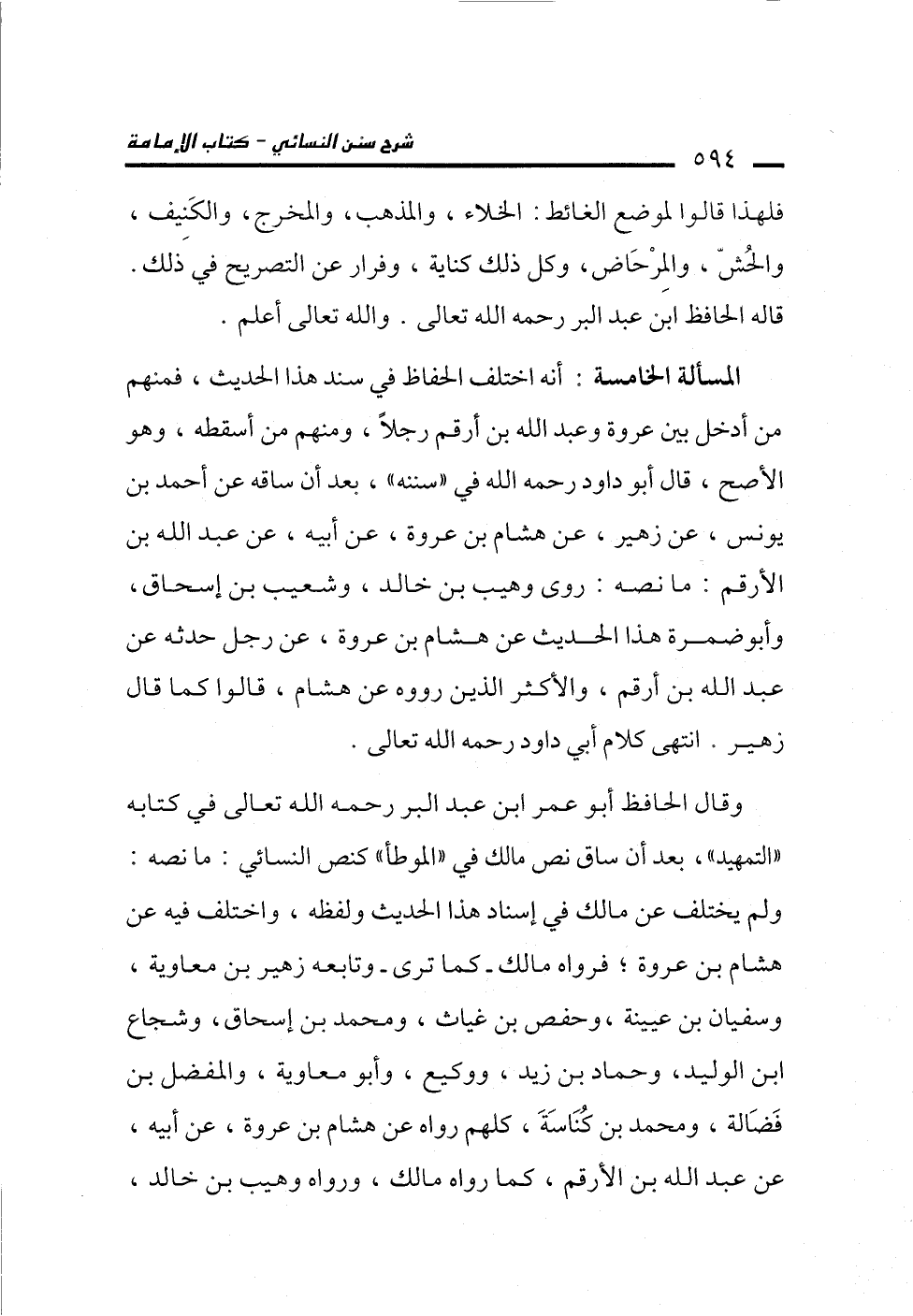 وقال الحافظ أبو عمر ابن عبد البر رحمه الله تعالى في كتابه "التمهيد"، بعد أن ساق نص مالك في "الموطأ" كنص النسائي: ما نصه: ولم يختلف عن مالك في إسناد هذا الحديث ولفظه، واختلف فيه عن هشام بن عروة؛ فرواه مالك -كما ترى- وتابعه زهير بن معاوية، وسفيان بن عيينة، وحفص بن غياث، ومحمد بن إسحاق، وشجاع ابن الوليد، وحماد بن زيد، ووكيع، وأبو معاوية، والمفضل بن فَضَالة، ومحمد بن كُنَاسَةَ، كلهم رواه عن هشام بن عروة، عن أبيه، عن عبد الله بن الأرقم، كما رواه مالك، ورواه وهيب بن خالد،