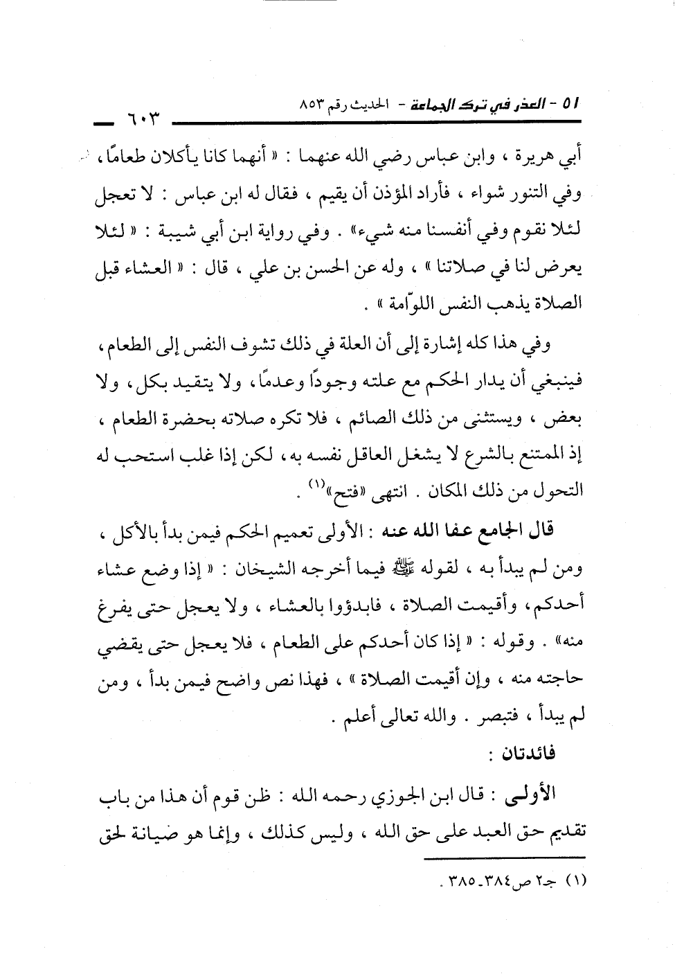 قال الجامع عفا الله عنه: الأولى تعميم الحكم فيمن بدأ بالأكل، ومن لم يبدأ به، لقوله -صلى الله عليه وسلم- فيما أخرجه الشيخان: "إذا وضع عشاء أحدكم، وأقيمت الصلاة، فابدؤوا بالعشاء، ولا يعجل حتى يفرغ منه". وقوله: "إذا كان أحدكم على الطعام، فلا يعجل حتى يقضي حاجته منه، وإن أقيمت الصلاة"، فهذا نص واضح فيمن بدأ، ومن لم يبدأ، فتبصر. والله تعالى أعلم.