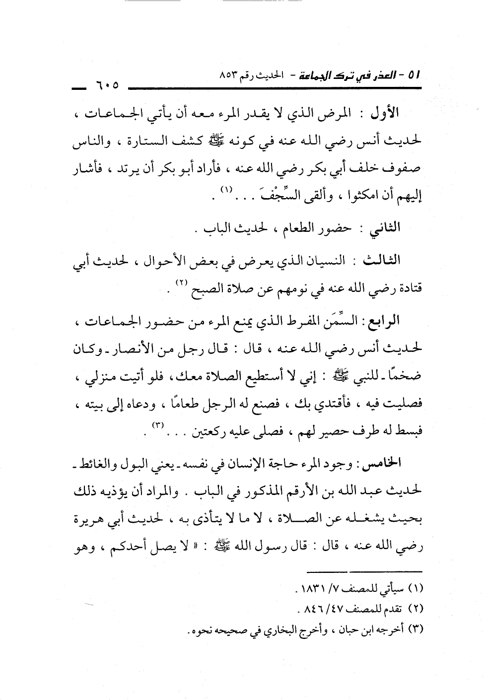 الخامس: وجود المرء حاجة الإنسان في نفسه -يعني البول والغائط- لحديث عبد الله بن الأرقم المذكور في الباب. والمراد أن يؤذيه ذلك بحيث يشغله عن الصلاة، لا ما لا يتأذى به، لحديث أبي هريرة رضي الله عنه، قال: قال رسول الله -صلى الله عليه وسلم-: "لا يصل أحدكم، وهو