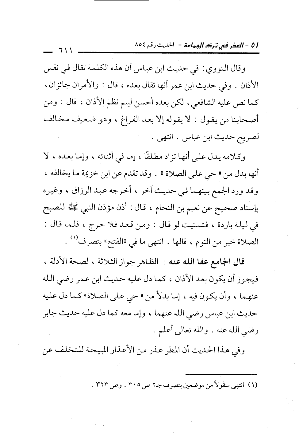 قال الجامع عفا الله عنه: الظاهر جواز الثلاثة، لصحة الأدلة، فيجوز أن يكون بعد الأذان، كما دل عليه حديث ابن عمر رضي الله عنهما، وأن يكون فيه، إما بدلاً من "حي على الصلاة" كما دل عليه حديث ابن عباس رضي الله عنهما، وإما معه كما دل عليه حديث جابر رضي الله عنه. والله تعالى أعلم.