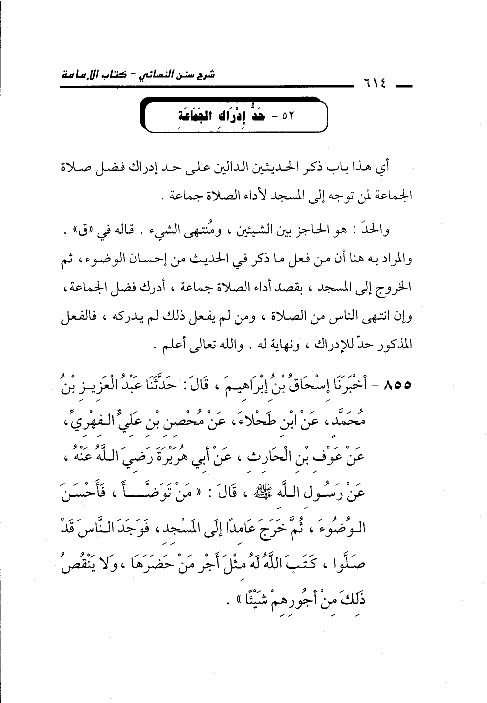 855 - أَخْبَرَنَا إِسْحَاقُ بْنُ إِبْرَاهِيمَ، قَالَ: حَدَّثَنَا عَبْدُ الْعَزِيزِ بْنُ مُحَمَّدٍ، عَنِ ابْنِ طَحْلاَءَ، عَنْ مُحْصِنِ بْنِ عَلِيٍّ الْفِهْرِيِّ، عَنْ عَوْفِ بْنِ الْحَارِثِ، عَنْ أَبِي هُرَيْرَةَ رَضِي اللهُ عَنْهُ، عَنْ رَسُولِ اللَّهِ -صلى الله عليه وسلم-، قَالَ: "مَنْ تَوَضَّأَ، فَأَحْسَنَ الْوُضُوءَ، ثُمَّ خَرَجَ عَامِدًا إِلَى الْمَسْجِدِ، فَوَجَدَ النَّاسَ قَدْ صَلَّوْا، كَتَبَ اللَّهُ لَهُ مِثْلَ أَجْرِ مَنْ حَضَرَهَا، وَلاَ يَنْقُصُ ذَلِكَ مِنْ أُجُورِهِمْ شَيْئًا".