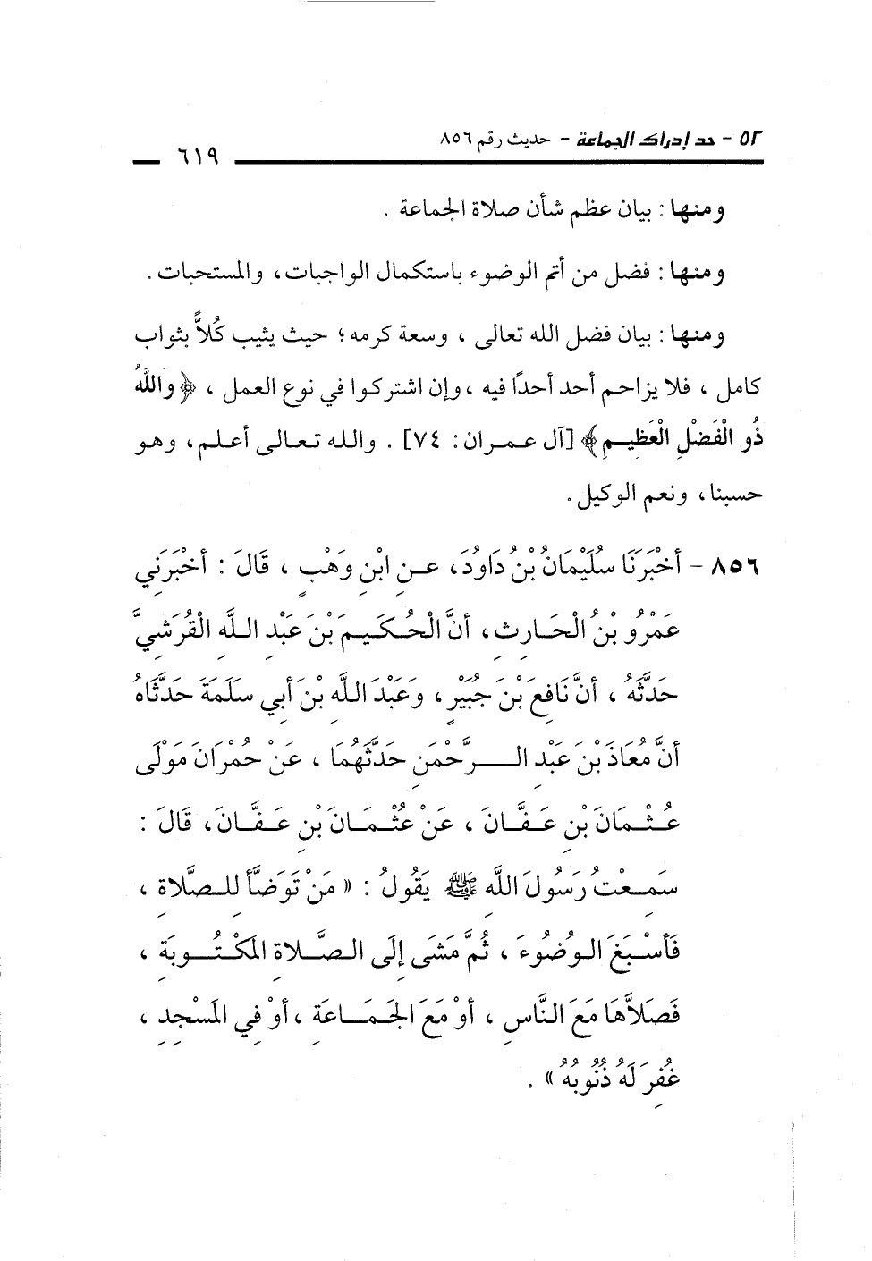 856 - أَخْبَرَنَا سُلَيْمَانُ بْنُ دَاوُدَ، عَنِ ابْنِ وَهْبٍ، قَالَ: أَخْبَرَنِي عَمْرُو بْنُ الْحَارِثِ، أَنَّ الْحُكَيْمَ بْنَ عَبْدِ اللَّهِ الْقُرَشِيَّ حَدَّثَهُ، أَنَّ نَافِعَ بْنَ جُبَيْرٍ، وَعَبْدَ اللَّهِ بْنَ أَبِي سَلَمَةَ حَدَّثَاهُ أَنَّ مُعَاذَ بْنَ عَبْدِ الرَّحْمَنِ حَدَّثَهُمَا، عَنْ حُمْرَانَ مَوْلَى عُثْمَانَ بْنِ عَفَّانَ، عَنْ عُثْمَانَ بْنِ عَفَّانَ، قَالَ: سَمِعْتُ رَسُولَ اللَّهِ -صلى الله عليه وسلم- يَقُولُ: "مَنْ تَوَضَّأَ لِلصَّلاَةِ، فَأَسْبَغَ الْوُضُوءَ، ثُمَّ مَشَى إِلَى الصَّلاَةِ الْمَكْتُوبَةِ، فَصَلاَّهَا مَعَ النَّاسِ، أَوْ مَعَ الْجَمَاعَةِ، أَوْ فِي الْمَسْجِدِ، غَفَرَ اللَّهُ لَهُ ذُنُوبَهُ".