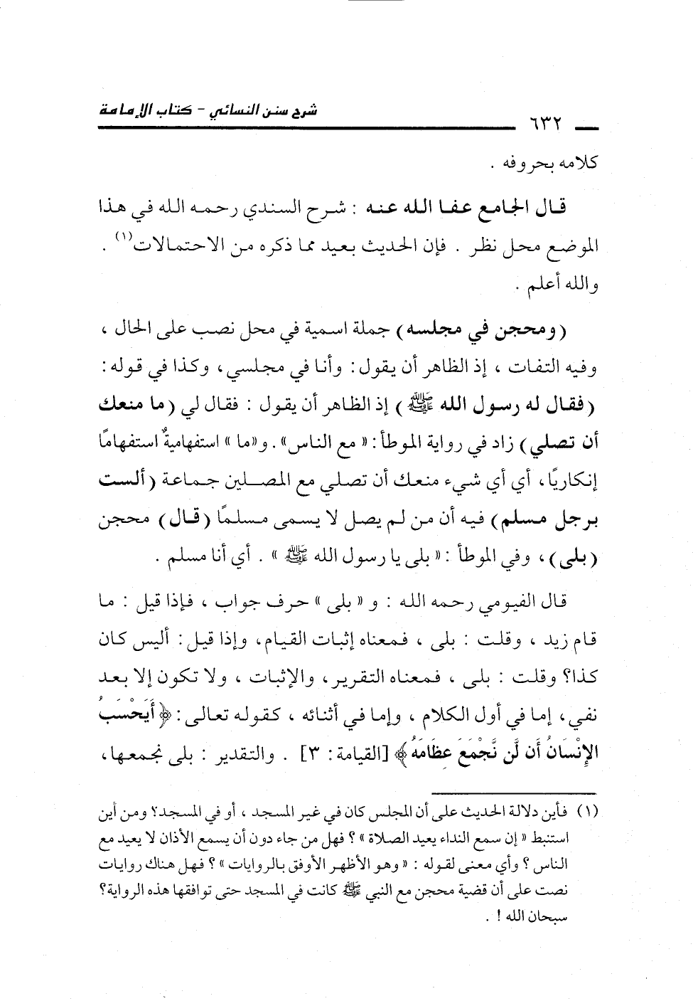 قال الجامع عفا الله عنه: شرح السندي رحمه الله في هذا الموضع محل نظر. فإن الحديث بعيد مما ذكره من الاحتمالات (¬1). والله أعلم.