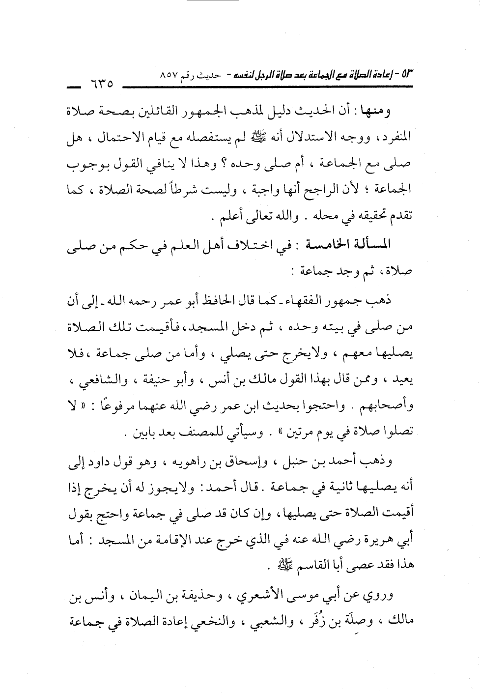 المسألة الخامسة: في اختلاف أهل العلم في حكم من صلى صلاة، ثم وجد جماعة: