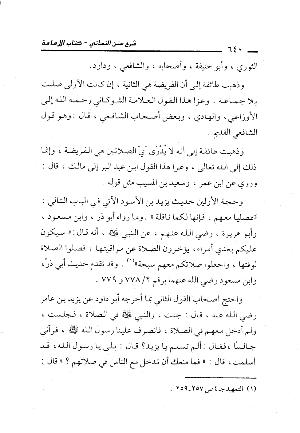 وحجة الأولين حديث يزيد بن الأسود الآتي في الباب التالي: "فصليا معهم، فإنها لكما نافلة". وما رواه أبو ذر، وابن مسعود، وأبو هريرة، رضي الله عنهم، عن النبي -صلى الله عليه وسلم-، أنه قال: "سيكون عليكم بعدي أمراء، يؤخرون الصلاة عن مواقيتها، فصلوا الصلاة لوقتها، واجعلوا صلاتكم معهم سبحة" (¬1). وقد تقدم حديث أبي ذرّ، وابن مسعود رضي الله عنهما برقم 2/ 778 و779.