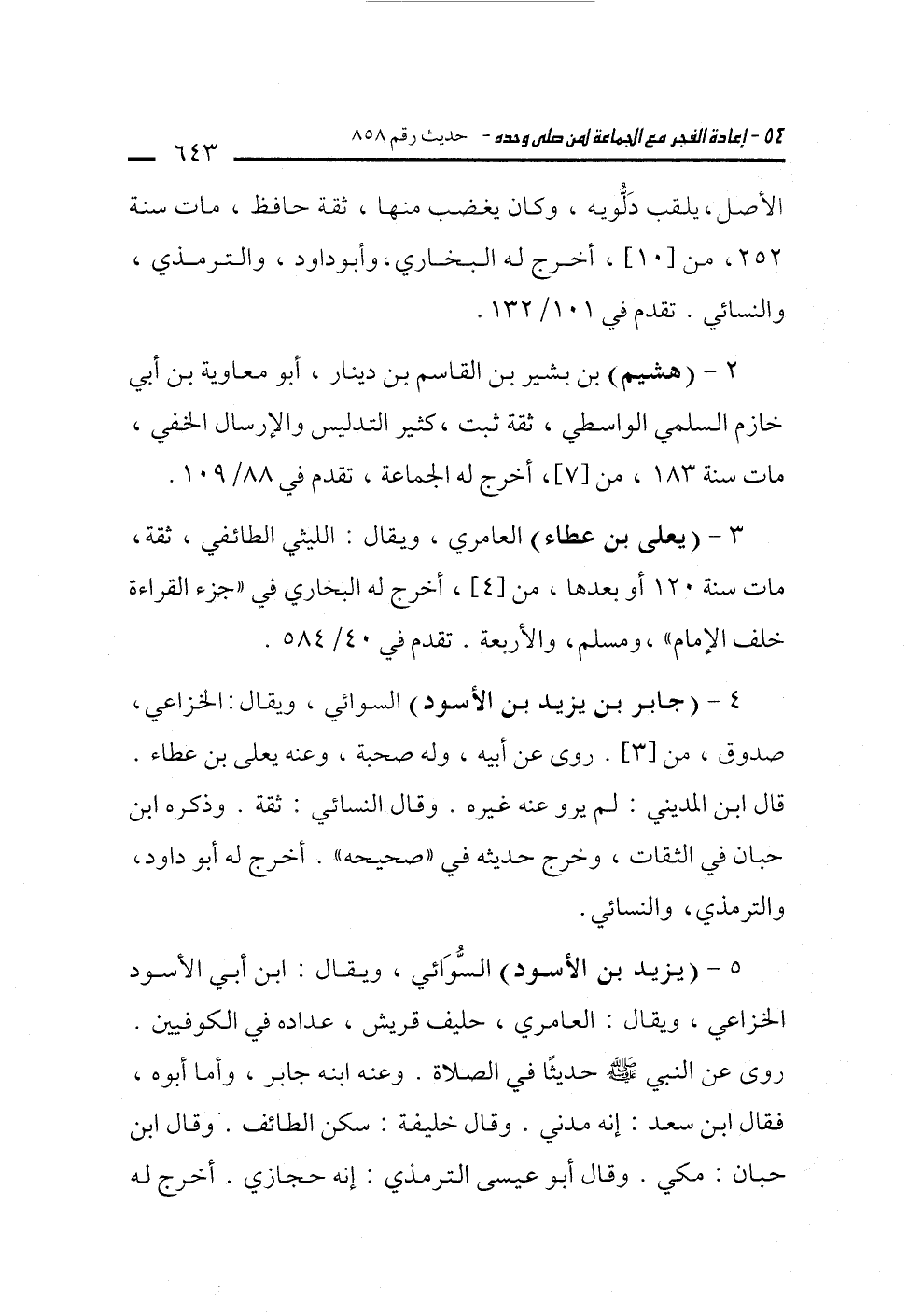 4 - (جابر بن يزيد بن الأسود) السوائي، ويقال: الخزاعي، صدوق، من [3]. روى عن أبيه، وله صحبة، وعنه يعلي بن عطاء. قال ابن المديني: لم يرو عنه غيره. وقال النسائي: ثقة. وذكره ابن حبان في الثقات، وخرج حديثه في "صحيحه". أخرج له أبو داود، والترمذي، والنسائي.