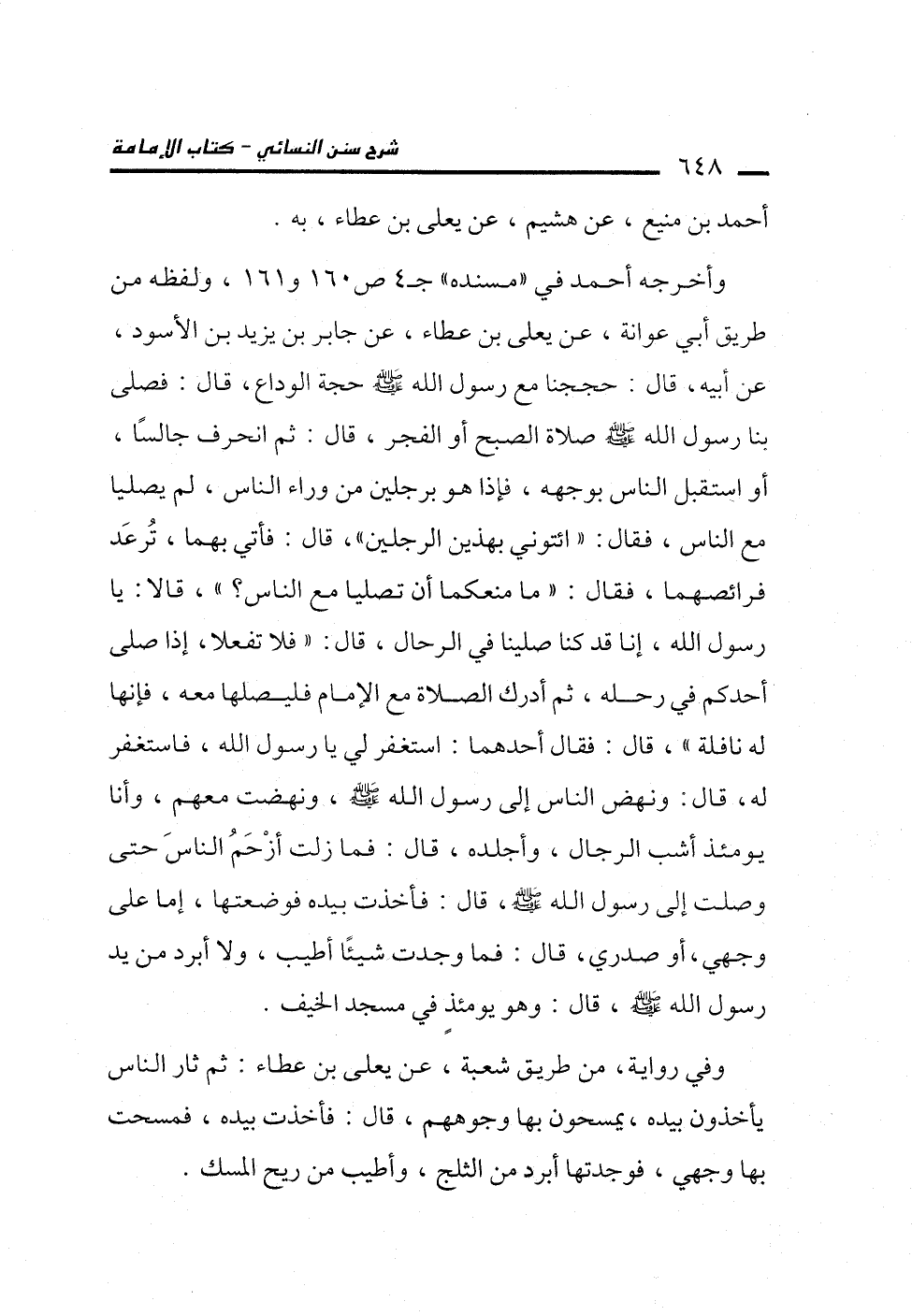 وأخرجه أحمد في "مسنده" جـ 4 ص 160 و161، ولفظه من طريق أبي عوانة، عن يعلي بن عطاء، عن جابر بن يزيد بن الأسود، عن أبيه، قال: حججنا مع رسول الله -صلى الله عليه وسلم- ححة الوداع، قال: فصلى بنا رسول الله -صلى الله عليه وسلم- صلاة الصبح أو الفجر، قال: ثم انحرف جالسًا، أو استقبل الناس بوجهه، فإذا هو برجلين من وراء الناس، لم يصليا مع الناس، فقال: "ائتوني يهذين الرجلين"، قال: فأتي بهما، تُرعَد فرائصهما، فقال: "ما منعكما أن تصليا مع الناس؟ "، قالا: يا رسول الله، إنا قد كنا صلينا في الرحال، قال: "فلا تفعلا، إذا صلى أحدكم في رحله، ثم أدرك الصلاة مع الإِمام فليصلها معه، فإنها له نافلة"، قال: فقال أحدهما: استغفر لي يا رسول الله، فاستغفر له، قال: ونهض الناس إلى رسول الله -صلى الله عليه وسلم-، ونهضت معهم، وأنا يومئذ أشب الرجال، وأجلده، قال. فما زلت أزْحَمُ الناسَ حتى وصلت إلى رسول الله -صلى الله عليه وسلم-، قال: فأخذت بيده فوضعتها، إما على وجهي، أو صدري، قال: فما وجدت شيئًا أطيب، ولا أبرد من يد رسول الله -صلى الله عليه وسلم-، قال: وهو يومئذٍ في مسجد الخيف.