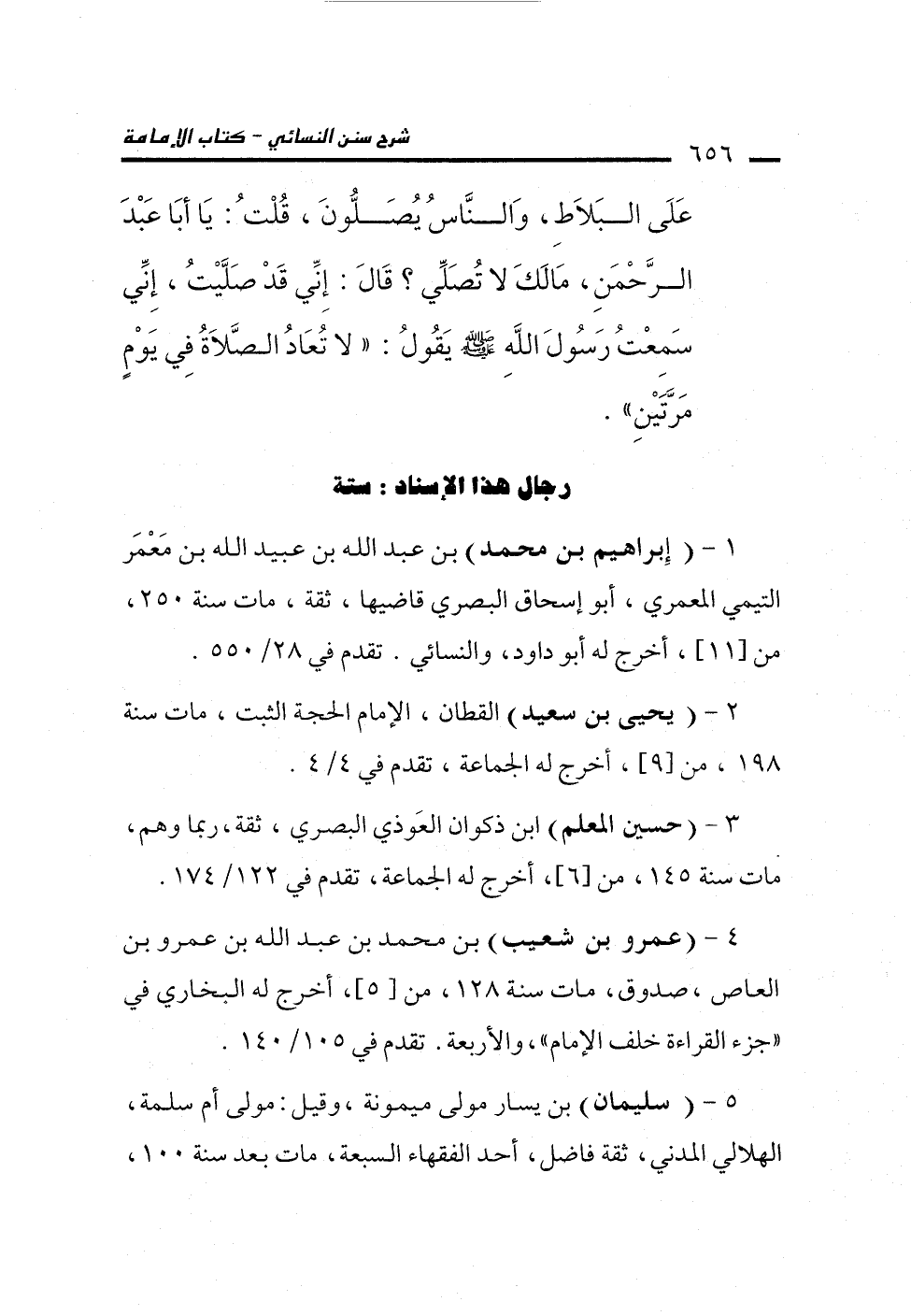 جَالِسًا عَلَى الْبَلاَطِ، وَالنَّاسُ يُصَلُّونَ، قُلْتُ: يَا أَبَا عَبْدِ الرَّحْمَنِ، مَا لَكَ لاَ تُصَلِّي؟ قَالَ: إِنِّي قَدْ صَلَّيْتُ، إِنِّي سَمِعْتُ رَسُولَ اللَّهِ -صلى الله عليه وسلم- يَقُولُ: "لاَ تُعَادُ الصَّلاَةُ فِي يَوْمٍ مَرَّتَيْنِ".