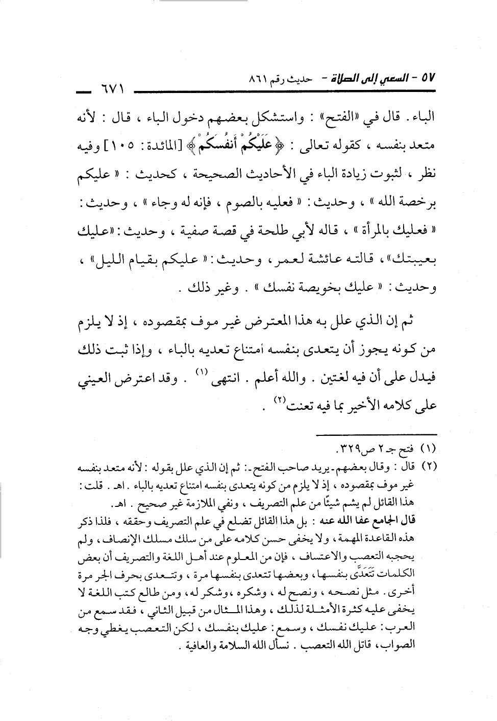 قال الجامع عفا الله عنه: بل هذا القائل تضلع في علم التصريف وحققه، فلذا ذكر هذه القاعدة المهمة، ولا يخفى حسن كلامه على من سلك مسلك الإنصاف، ولم يحجبه التعصب والاعتساف، فإن من المعلوم عند أهل اللغة والتصريف أن بعض الكلمات تَتَعَدَّى بنفسها، وبعضها تتعدى بنفسها مرة، وتتعدى بحرف الجر مرة أخرى. مثل نصحه، ونصح له، وشكره، وشكر له، ومن طالع كتب اللغة لا يخفى عليه كثرة الأمثلة لذلك، وهذا المثال من قبيل الثاني، فقد سمع من العرب: عليك نفسك، وسمع: عليك بنفسك، لكن التعصب يغطي وجه الصواب، قاتل الله التعصب. نسأل الله السلامة والعافية.