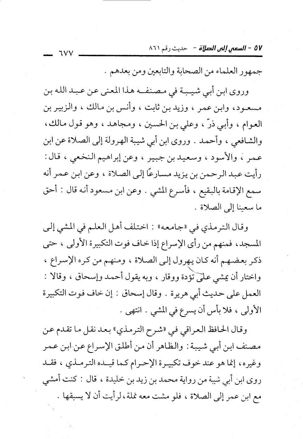 وقال الحافظ العراقي في "شرح الترمذي" بعد نقل ما تقدم عن مصنف ابن أبي شيبة. والظاهر أن من أطلق الإسراع عن ابن عمر وغيره، إنما هو عند خوف تكبيرة الإحرام كما قيده الترمذي، فقد روى ابن أبي شيبة من رواية محمد بن زيد بن خليدة، قال: كنت أمشي مع ابن عمر إلى الصلاة، فلو مشت معه نملة، لرأيت أن لا يسبقها.