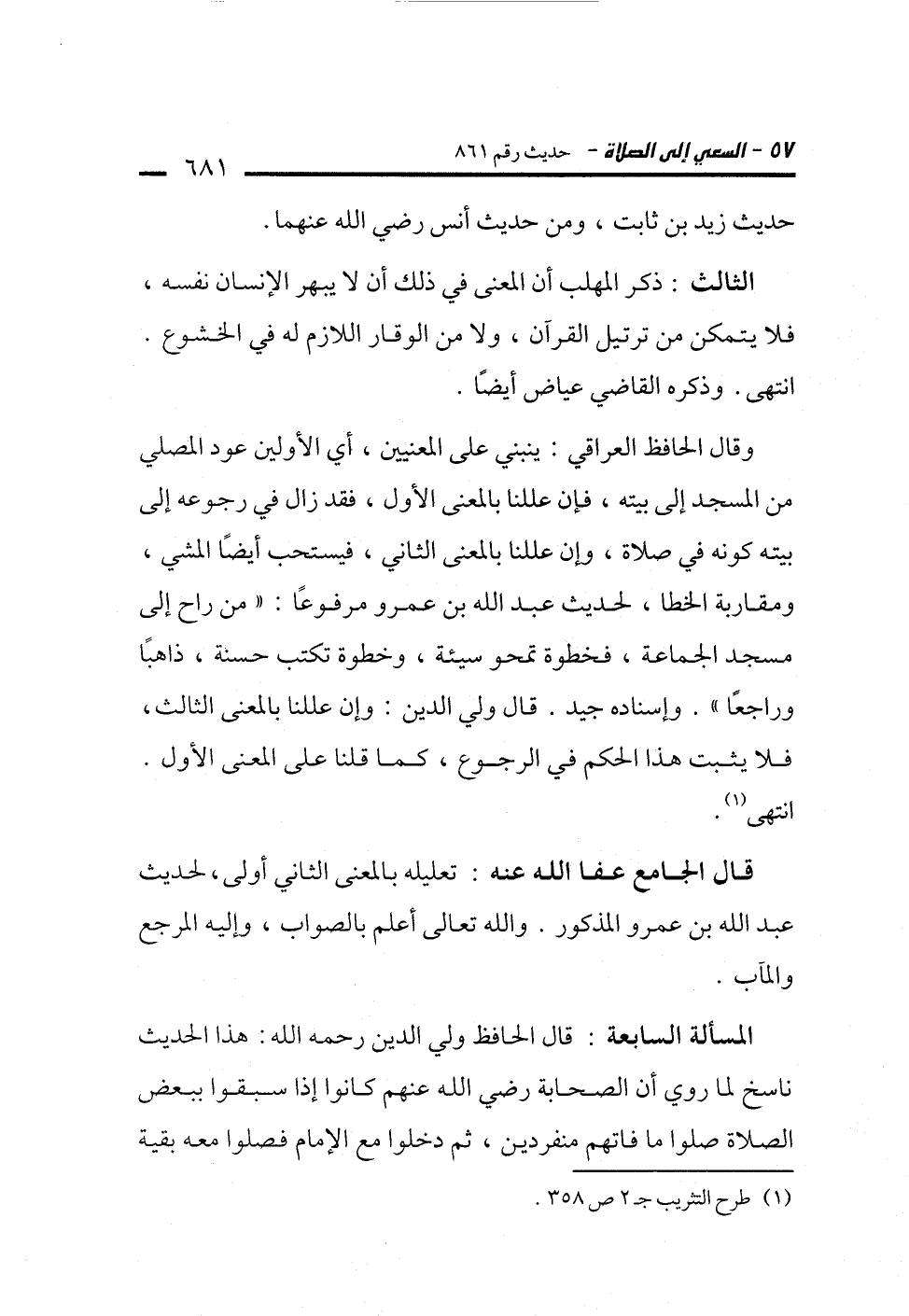 وقال الحافظ العراقي: ينبني على المعنيين، أي الأولين عود المصلي من المسجد إلى بيته، فإن عللنا بالمعنى الأول، فقد زال في رجوعه إلى بيته كونه في صلاة، وإن عللنا بالمعنى الثاني، فيستحب أيضًا المشي، ومقاربة الخطا، لحديث عبد الله بن عمرو مرفوعًا: "من راح إلى مسجد الجماعة، فخطوة تمحو سيئة، وخطوة تكتب حسنة، ذاهبًا وراجعًا". وإسناده جيد. قال ولي الدين: وإن عللنا بالمعنى الثالث، فلا يثبت هذا الحكم في الرجوع، كما قلنا على المعنى الأول. انتهى (¬1).