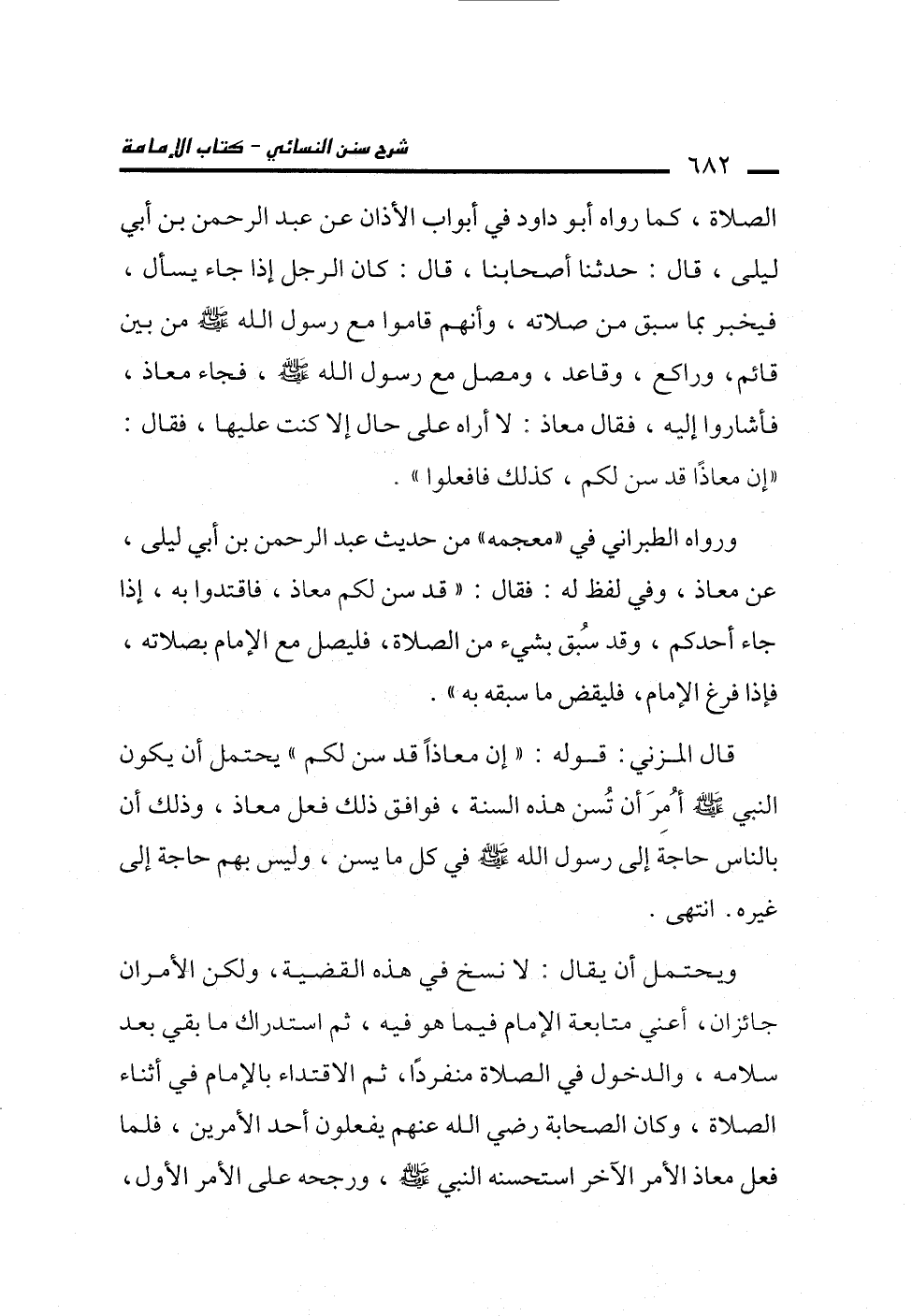 ويحتمل أن يقال: لا نسخ في هذه القضية، ولكن الأمران جائزان، أعني متابعة الإِمام فيما هو فيه، ثم استدراك ما بقي بعد سلامه، والدخول في الصلاة منفردًا، ثم الاقتداء بالإمام في أثناء الصلاة، وكان الصحابة رضي الله عنهم يفعلون أحد الأمرين، فلما فعل معاذ الأمر الآخر استحسنه النبي -صلى الله عليه وسلم-، ورجحه على الأمر الأول،