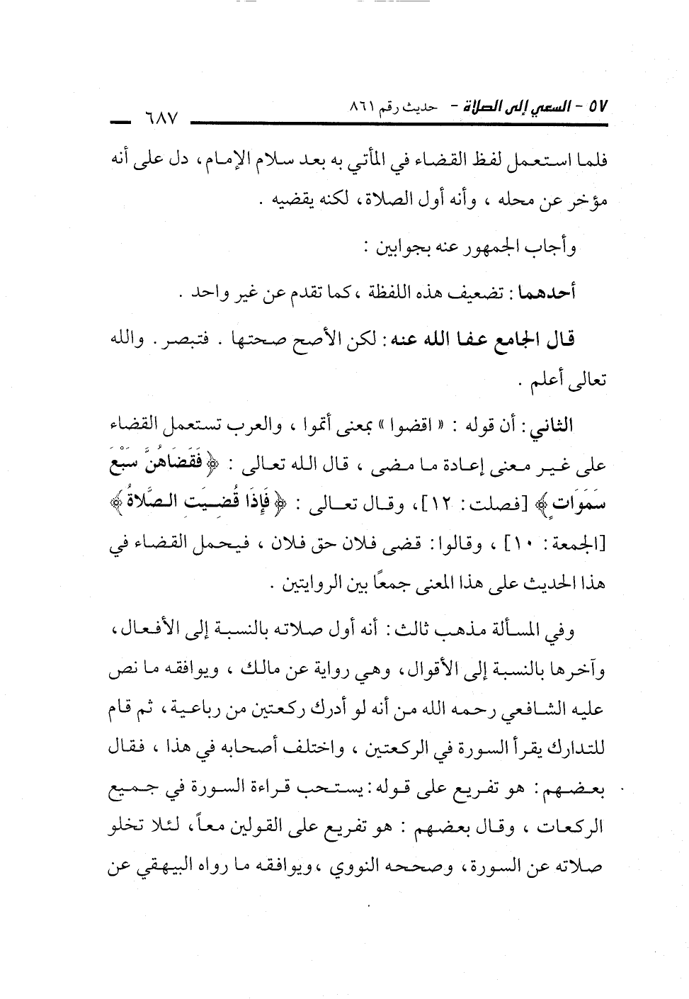الثاني: أن قوله: "اقضوا" بمعنى أتموا، والعرب تستعمل القضاء على غير معنى إعادة ما مضى، قال الله تعالى: {فَقَضَاهُنَّ سَبْعَ سَمَاوَاتٍ} [فصلت: 12]، وقال تعالى: {فَإِذَا قُضِيَتِ الصَّلَاةُ} [الجمعة: 10]، وقالوا: قضى فلان حق فلان، فيحمل القضاء في هذا الحديث على هذا المعنى جمعًا بين الروايتين.