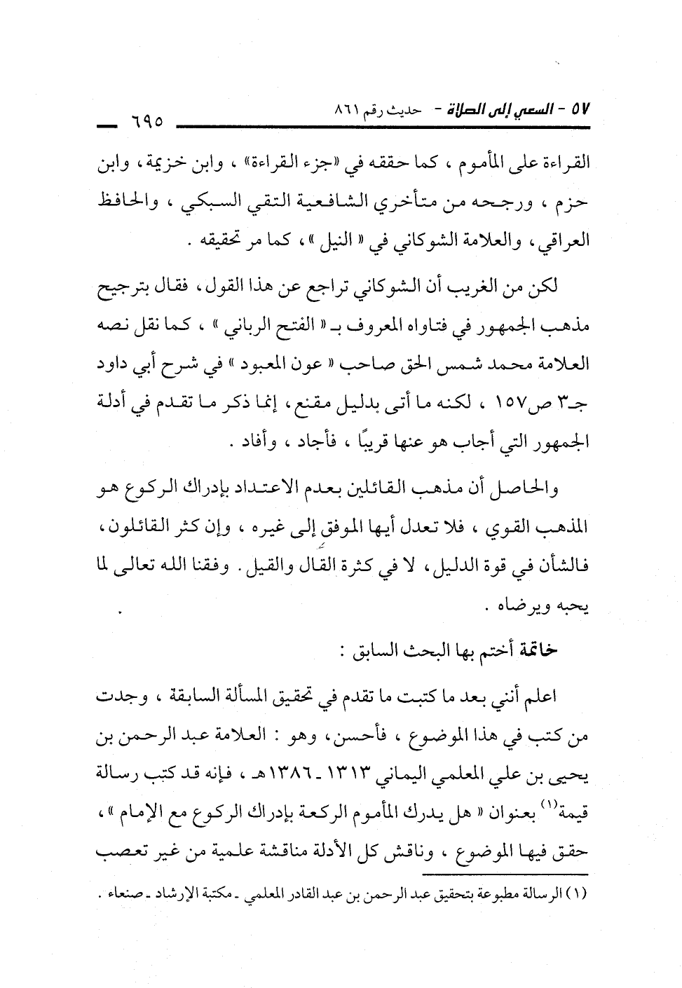 اعلم أنني بعدما كتبت ما تقدم في تحقيق المسألة السابقة، وجدت من كتب في هذا الموضوع، فأحسن، وهو: العلامة عبد الرحمن بن يحيى بن علي المعلمي اليماني 1313 - 1386 هـ، فإنه قد كتب رسالة قيمة (¬1) بعنوان "هل يدرك المأموم الركعة بإدراك الركوع مع الإِمام"، حقق فيها الموضوع، وناقش كل الأدلة مناقشة علمية من غير تعصب