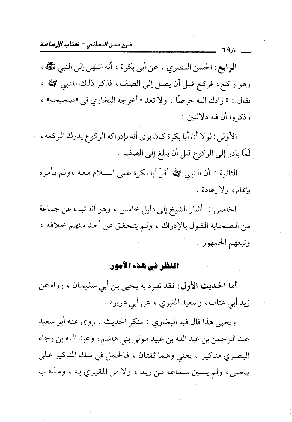 الثانية: أن النبي -صلى الله عليه وسلم- أقرّ أبا بكرة على السلام معه، ولم يأمره بإتمام، ولا إعادة.