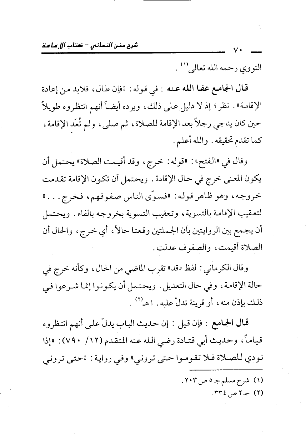 قال الجامع عفا الله عنه: في قوله: "فإن طال، فلابد من إعادة الإقامة". نظر؛ إذ لا دليل على ذلك، ويرده أيضاً أنهم انتظروه طويلاً حين كان يناجي رجلاً بعد الإقامة للصلاة، ثم صلى، ولم تُعَدِ الإقامة، كما تقدم تحقيقه. والله أعلم،