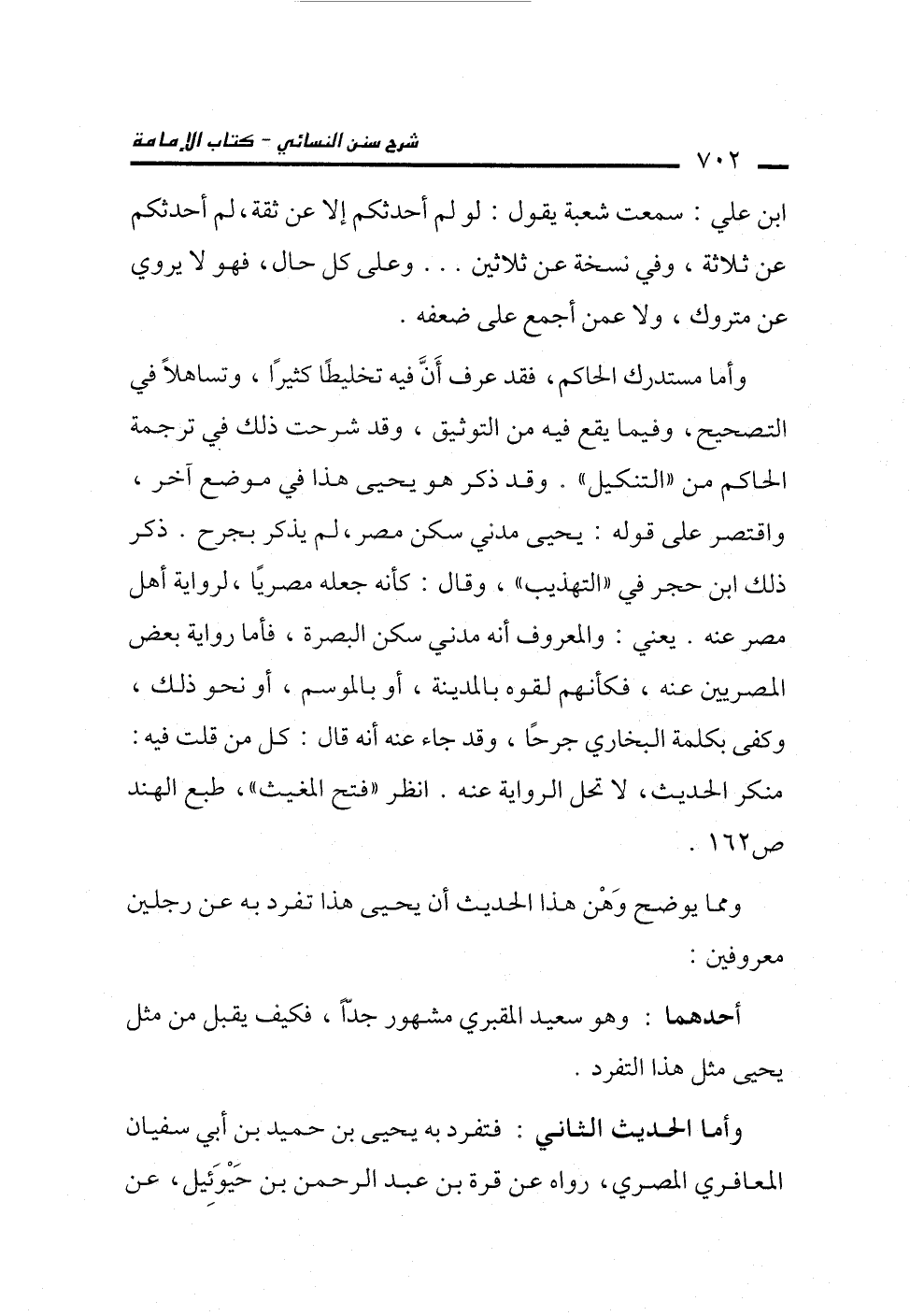وأما مستدرك الحاكم، فقد عرف أَنَّ فيه تخليطًا كثيراً، وتساهلاً في التصحيح، وفيما يقع فيه من التوثيق، وقد شرحت ذلك في ترجمة الحاكم من "التنكيل". وقد ذكر هو يحيى هذا في موضع آخر، واقتصر على قوله: يحيى مدني سكن مصر، لم يذكر بجرح. ذكر ذلك ابن حجر في "التهذيب"، وقال: كأنه جعله مصريًا، لرواية أهل مصر عنه. يعني: والمعروف أنه مدني سكن البصرة، فأما رواية بعض المصريين عنه، فكأنهم لقوه بالدينة، أو بالموسم، أو نحو ذلك، وكفى بكلمة البخاري جرحًا، وقد جاء عنه أنه قال: كل من قلت فيه: منكر الحديث، لا تحل الرواية عنه. انظر "فتح المغيث"، طبع الهند ص 162.