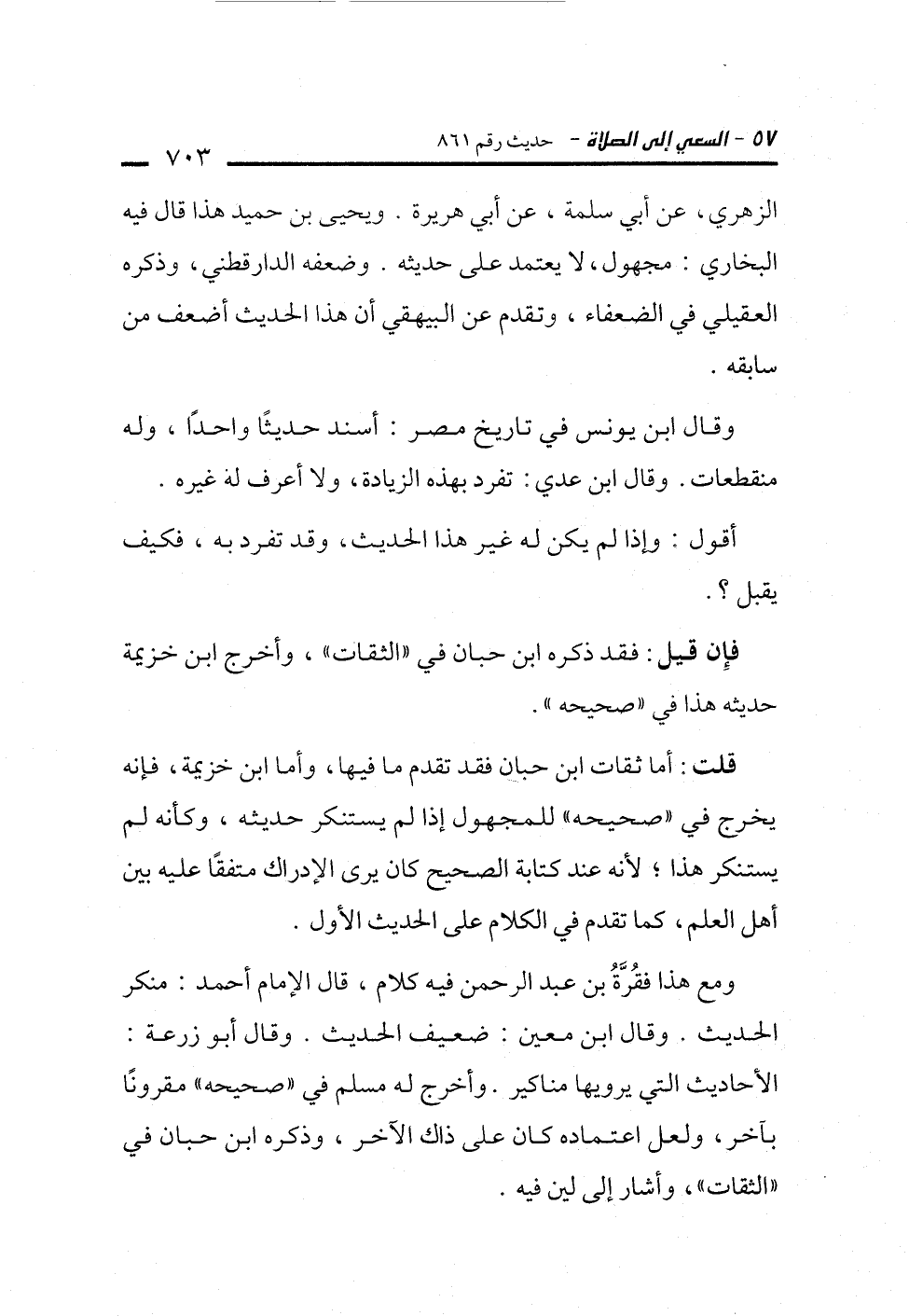 ومع هذا فقُرَّةُ بن عبد الرحمن فيه كلام، قال الإِمام أحممد: منكر الحديث. وقال ابن معين: ضعيف الحديث. وقال أبو زرعة: الأحاديث التي يرويها مناكير. وأخرج له مسلم في "صحيحه" مقرونًا بآخر، ولعل اعتماده كان على ذاك الآخر، وذكره ابن حبان في "الثقات"، وأشار إلى لين فيه.