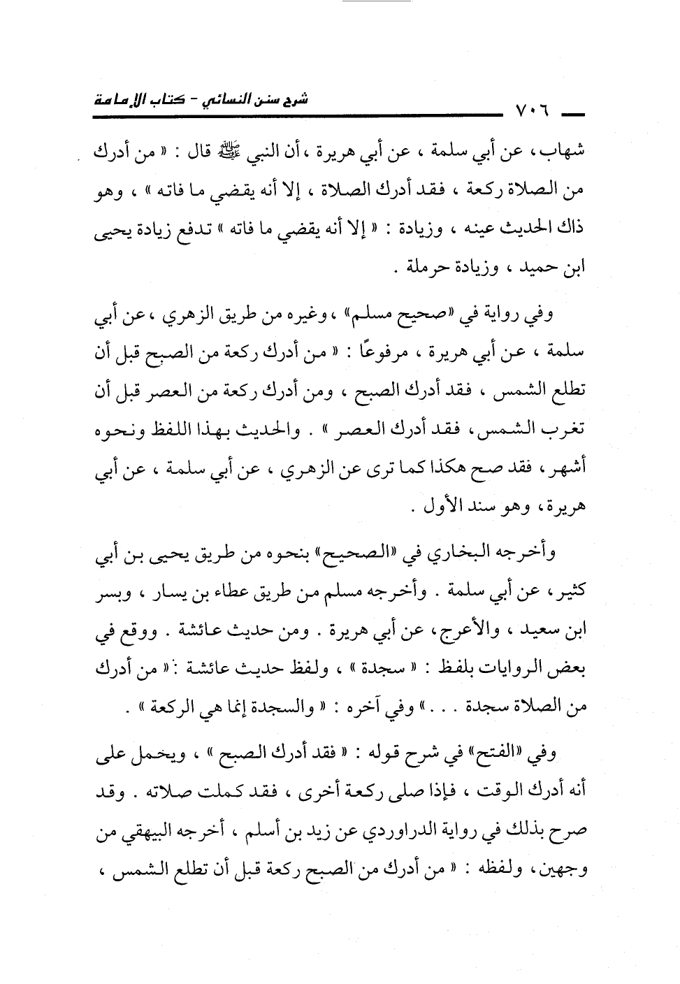 وفي رواية في "صحيح مسلم"، وغيره من طريق الزهري، عن أبي سلمة، عن أبي هريرة، مرفوعًا: "من أدرك ركعة من الصبح قبل أن تطلع الشمس، فقد أدرك الصبح، ومن أدرك ركعة من العصر قبل أن تغرب الشمس، فقد أدرك العصر". والحديث بهذا اللفظ ونحوه أشهر، فقد صح هكذا كما ترى عن الزهري، عن أبي سلمة، عن أبي هريرة، وهو سند الأول.