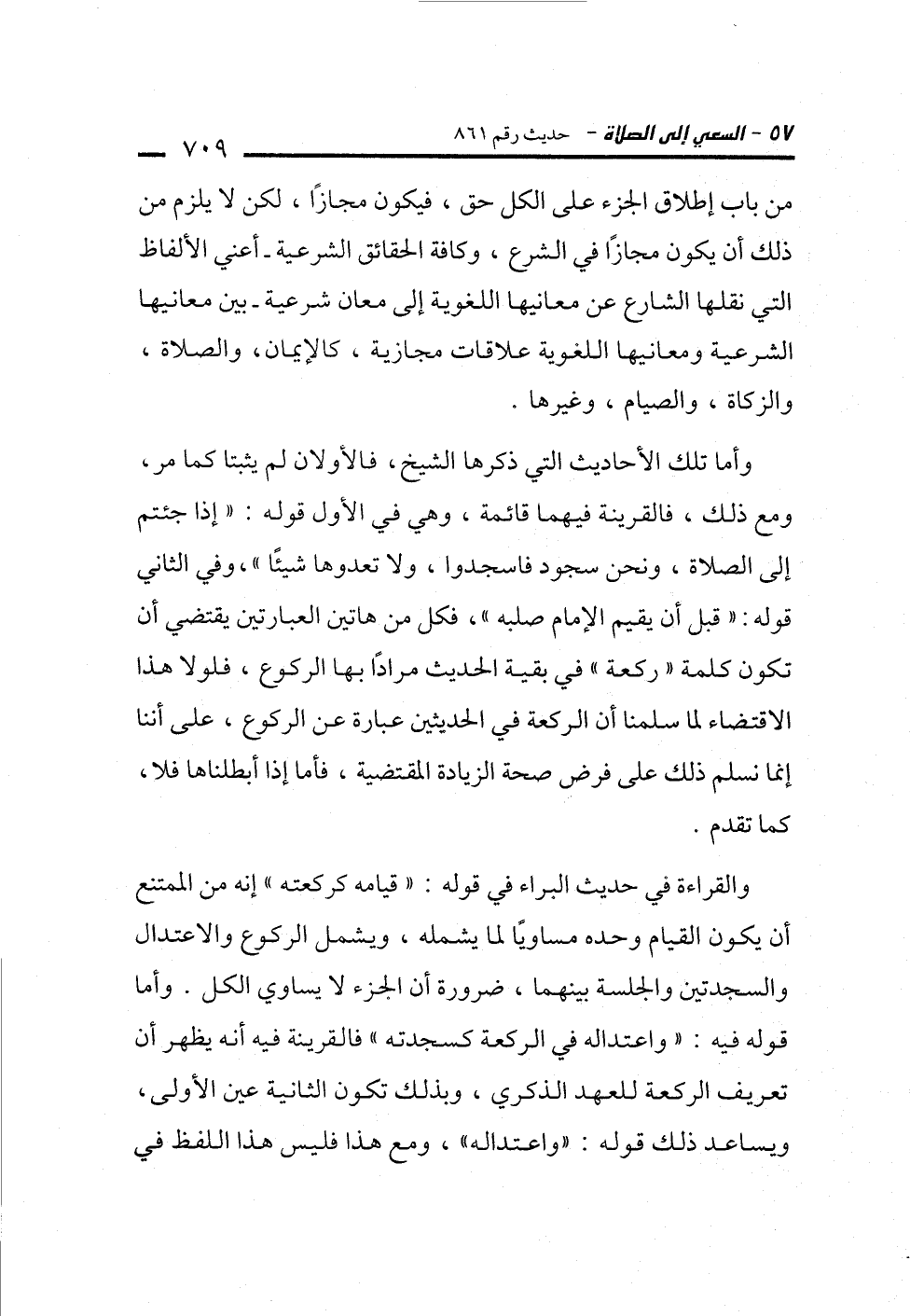 وأما تلك الأحاديث التي ذكرها الشيخ، فالأولان لم يثبتا كما مر، ومع ذلك، فالقرينة فيهما قائمة، وهي في الأول قوله: "إذا جئتم إلى الصلاة، ونحن سجود فاسجدوا، ولا تعدوها شيئًا"، وفي الثاني قوله: "قبل أن يقيم الإِمام صلبه"، فكل من هاتين العبارتين يقتضي أن تكون كلمة "ركعة" في بقية الحديث مرادًا بها الركوع، فلولا هذا الاقتضاء لما سلمنا أن الركعة في الحديثين عبارة عن الركوع، على أننا إنما نسلم ذلك على فرض صحة الزيادة المقتضية، فأما إذا أبطلناها فلا، كما تقدم.