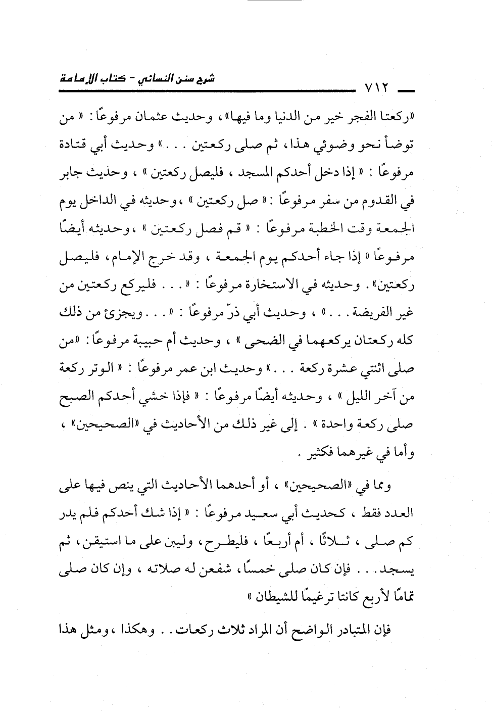 "ركعتا الفجر خير من الدنيا وما فيها"، وحديث عثمان مرفوعا: "من توضأ نحو وضوئي هذا، تم صلى ركعتين ... " وحديث أبي قتادة مرفوعًا: "إذا دخل أحدكم المسجد، فليصل ركعتين"، وحديث جابر في القدوم من سفر مرفوعًا: "صل ركعتين"، وحديثه في الداخل يوم الجمعة وقت الخطبة مرفوعًا: "قم فصل ركعتين"، وحديثه أيضًا مرفوعًا "إذا جاء أحدكم يوم الجمعة، وقد خرج الإِمام، فليصل ركعتين". وحديثه في الاستخارة مرفوعًا: " ... فليركع ركعتين من غير الفريضة ... "، وحديث أبي ذرّ مرفوعًا: " ... ويجزىء من ذلك كله ركعتان يركعهما في الضحى"، وحديث أم حبيبة مرفوعًا: "من صلى اثنتي عشرة ركعة ... " وحديث ابن عمر مرفوعًا: "الوتر ركعة من آخر الليل"، وحديثه أيضًا مرفوعًا: "فإذا خشي أحدكم الصبح صلى ركعة واحدة". إلى غير ذلك من الأحاديث في "الصحيحين"، وأما في غيرهما فكثير.