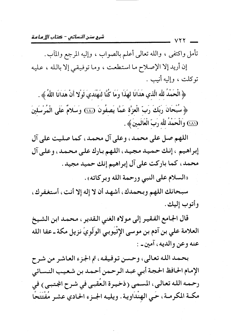 بحمد الله تعالى، وحسن توفيقه، تم الجزء العاشر من شرح الإِمام الحافظ الحجة أبي عبد الرحمن أحمد بن شعيب النسائي رحمه الله تعالى، المسمى (ذخيرة العُقبى في شرح المجتبى) في مكة المكرمة، حَي الهِنْدَاوية. ويليه الجزء الحادي عشر مُفْتَتَحًا