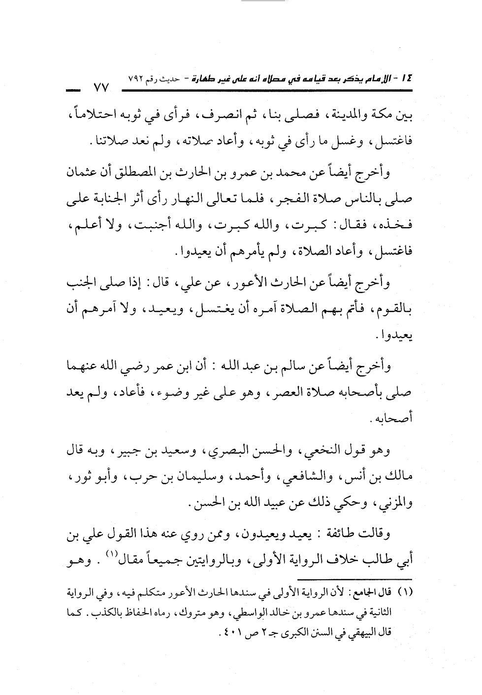 وأخرج أيضاً عن الحارث الأعور، عن علي، قال: إذا صلى الجنب بالقوم، فأتم بهم الصلاة آمره أن يغتسل، ويعيد، ولا آمرهم أن يعيدوا.