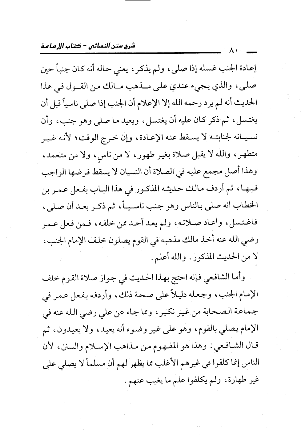 وأما الشافعي فإنه احتج بهذا الحديث في جواز صلاة القوم خلف الإمام الجنب، وجعله دليلاً على صحة ذلك، وأردفه بفعل عمر في جماعة الصحابة من غير نكير، ومما جاء عن علي رضي الله عنه في الإمام يصلي بالقوم، وهو على غير وضوء أنه يعيد، ولا يعيدون، ثم قال الشافعي: وهذا هو المفهوم من مذاهب الإسلام والسنن، لأن الناس إنما كلفوا في غيرهم الأغلب مما يظهر لهم أن مسلماً لا يصلي على غير طهارة، ولم يكلفوا علم ما يغيب عنهم.