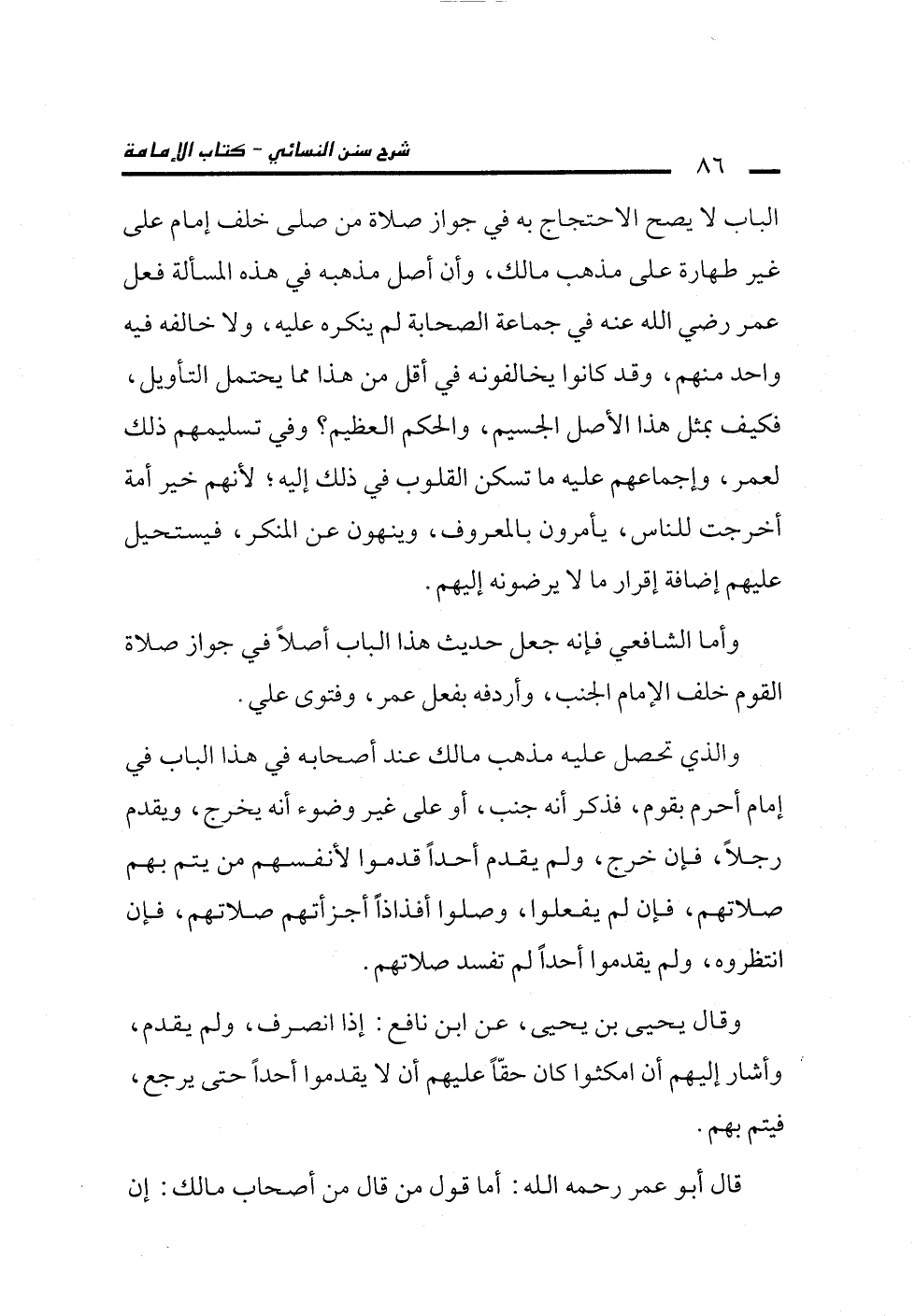 الباب لا يصح الاحتجاج به في جواز صلاة من صلى خلف إمام على غير طهارة على مذهب مالك، وأن أصل مذهبه في هذه المسألة فعل عمر رضي الله عنه في جماعة الصحابة لم ينكره عليه، ولا خالفه فيه واحد منهم، وقد كانوا يخالفونه في أقل من هذا مما يحتمل التأويل، فكيف بمثل هذا الأصل الجسيم، والحكم العظيم؟ وفي تسليمهم ذلك لعمر، وإجماعهم عليه ما تسكن القلوب في ذلك إليه؛ لأنهم خير أمة أخرجت للناس، يأمرون بالمعروف، وينهون عن المنكر، فيستحيل عليهم إضافة إقرار ما لا يرضونه إليهم.